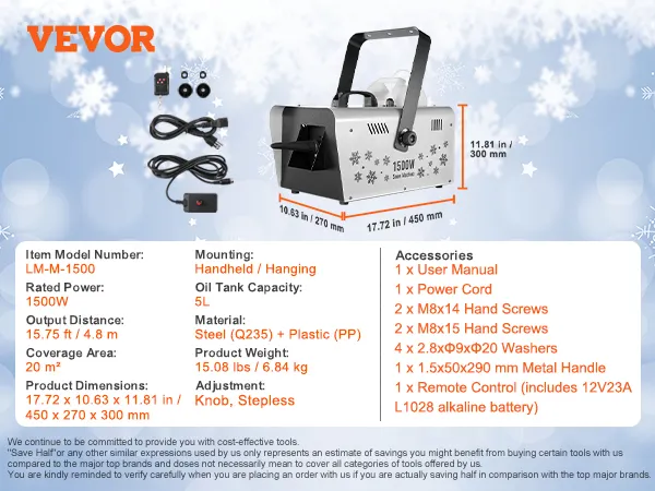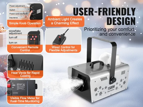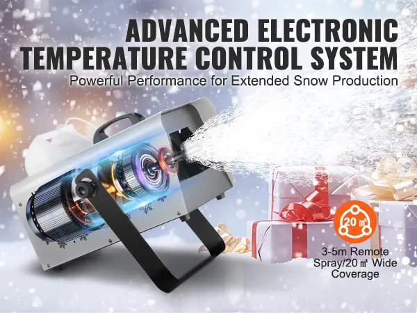 De sneeuwmachine heeft een motor van 1500 W en een tank van 5 liter. Met een spuitbereik en dekkingsgebied zorgen het elektronische thermostaatcontrolesysteem en de kwaliteitschips voor stabiele prestaties.