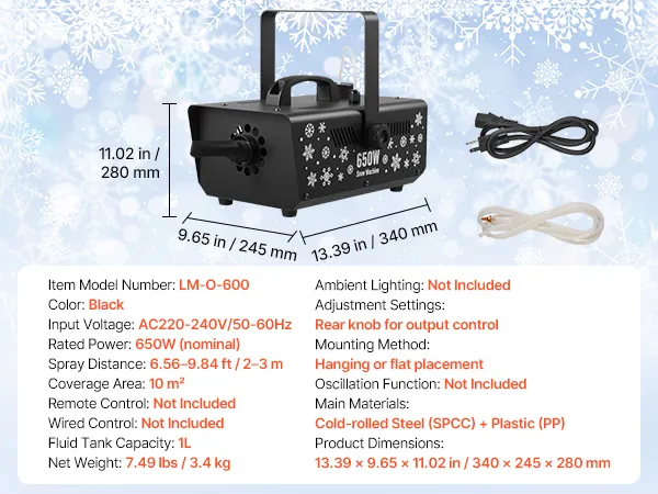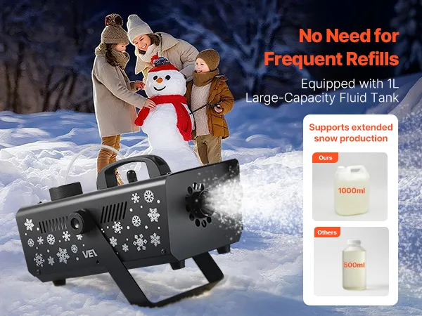 Uitgerust met een vloeistoftank van 1 liter, maakt het langdurig sneeuw produceren mogelijk zonder constant bijvullen. Onze sneeuwkanon is ideaal voor feesten, kleine podia en evenementenlocaties waar een constante sneeuwstroom nodig is om ononderbroken een magische sfeer te behouden.