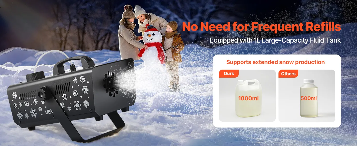 Krachtig sneeuweffect: Uitgerust met een 650 watt motor met 32.000 tpm, biedt deze sneeuwmachine een spuitbereik van 2-3 m en creëert realistisch sneeuwachtig schuim dat tot 10 m² bedekt. De grote tank van 1 liter zorgt voor een langdurige werking – ideaal om elke scène een winterse sfeer te geven.