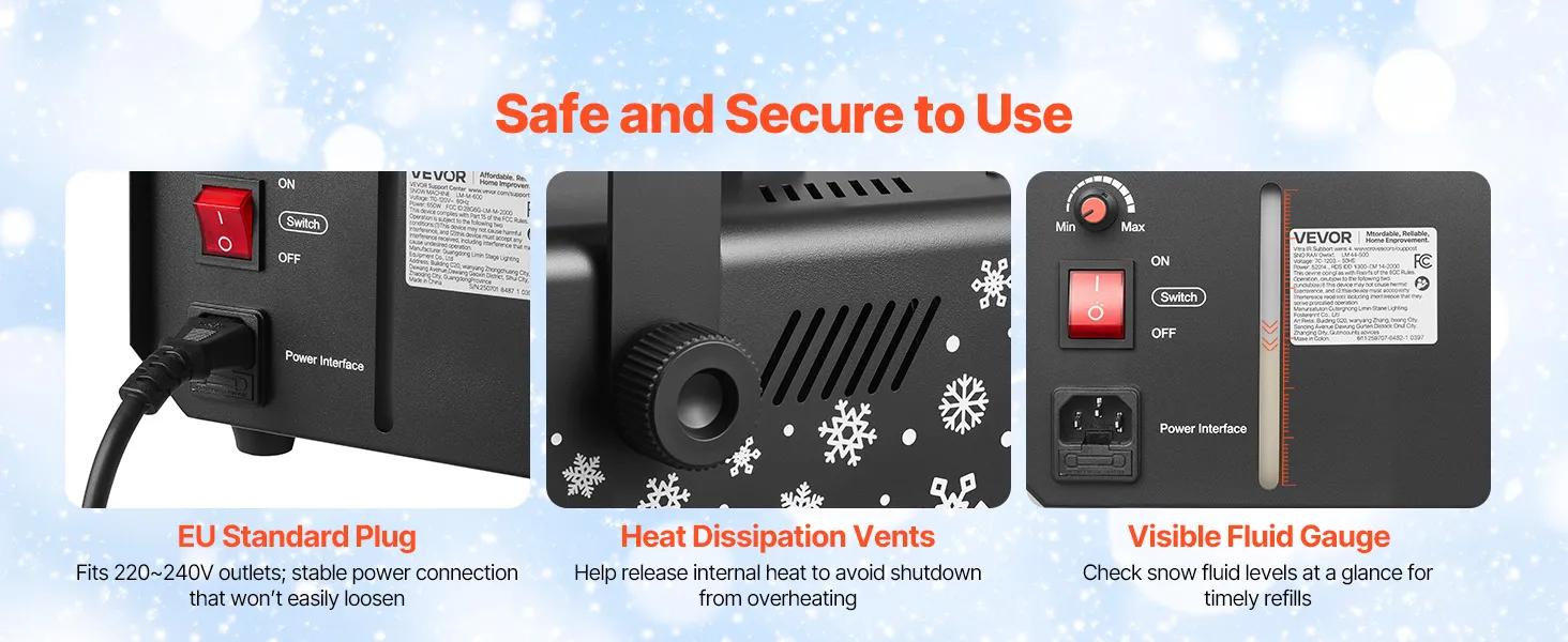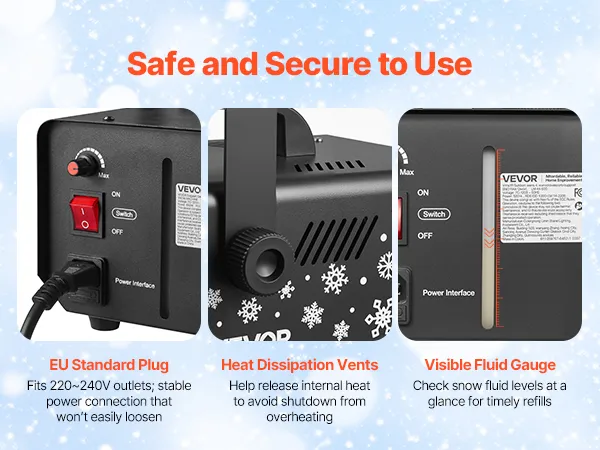 Uitgerust met een driehoekige stekker voor een stabiele werking en warmteafvoerende ventilatieopeningen die de levensduur van de kunstsneeuwmachine verlengen. Een zichtbare niveau-indicator geeft u in één oogopslag inzicht in de resterende hoeveelheid sneeuwvloeistof, waardoor het risico op drooglopen of plotselinge uitval wordt verkleind.