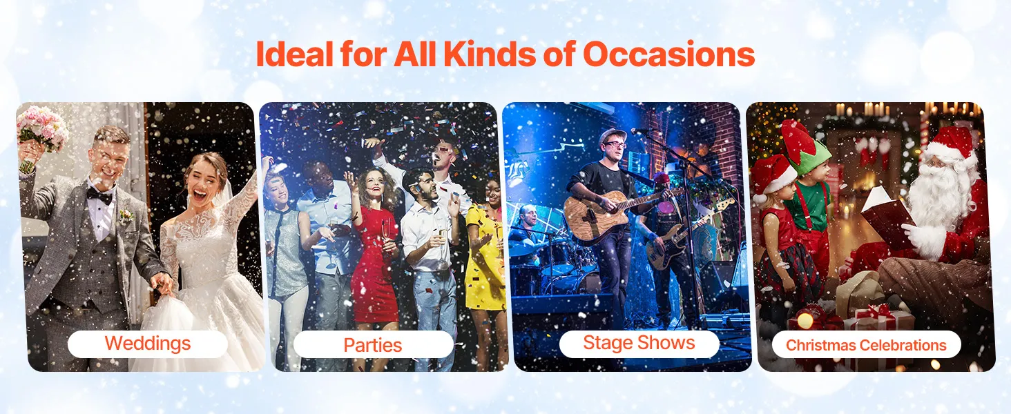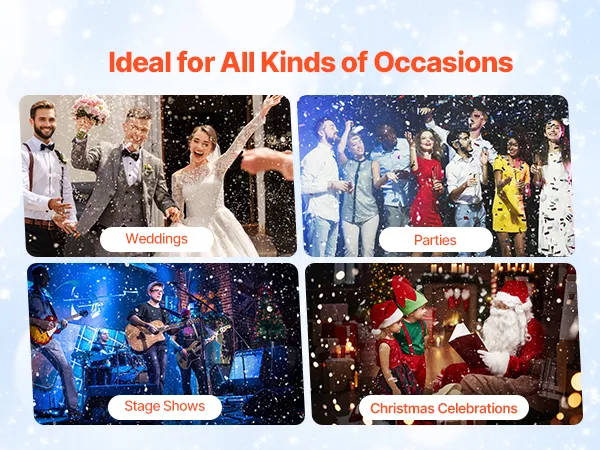Veelzijdige toepassing: De kunstsneeuwmachine is ideaal voor festivals, bruiloften, feesten of winkelpresentaties. Deze kunstmatige sneeuwvlokmachine creëert direct magische sneeuweffecten die de sfeer verbeteren, vrolijkheid opwekken en een blijvende indruk achterlaten.