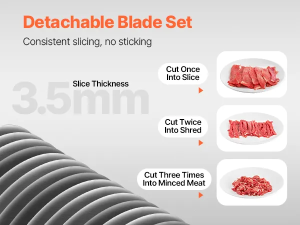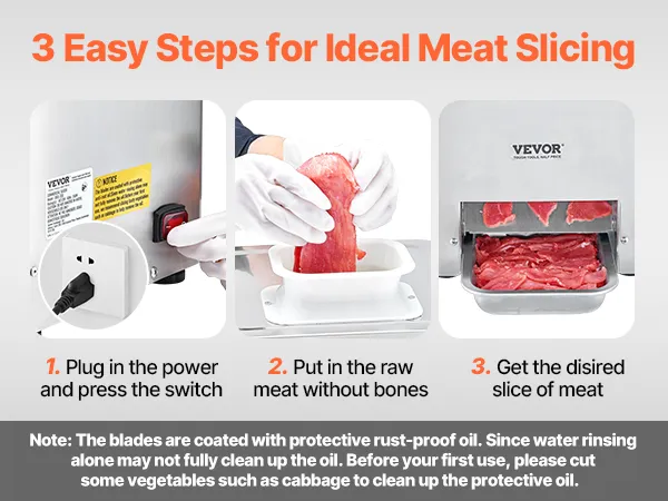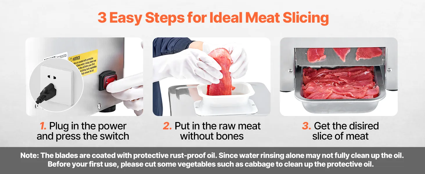 Effortless Cleaning & Care: Our meat cutter cutting machine is easy to clean and maintain. The blades are coated with protective rust-proof oil. Since water rinsing alone may not fully clean up the oil, please cut some vegetables, such as cabbage, to clean up the protective oil before your first use.