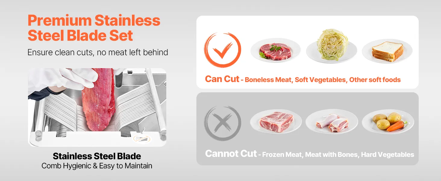Handles Multiple Ingredients: Our meat cutter machine comes with a widened and enlarged feed port for added security and convenience. It's great for cutting boneless meats like pork, lamb, beef, and fish, as well as soft vegetables like cabbage and mushrooms. Not suitable for bone-in meats, frozen foods, or hard vegetables like potatoes, carrots, and lotus roots.