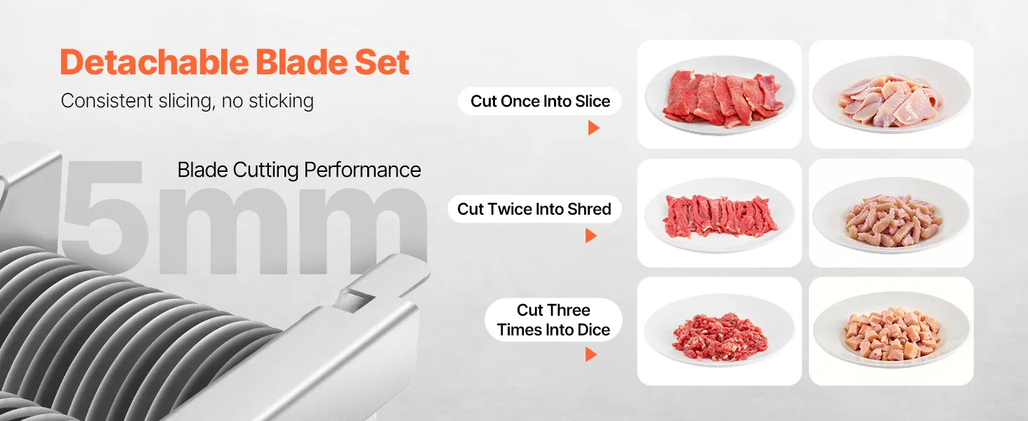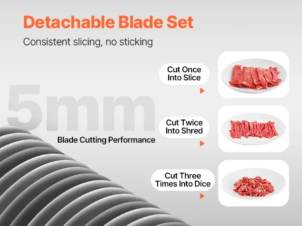 Detachable Blades for Easy Slicing: The stainless steel blade set is built to last and is easy to clean. With a sharp Ф86 mm blade and a 5mm slice thickness, you can enjoy quick, clean slices without worrying about jams or leftover meat. Need a different thickness? Simply detach and replace the blades as needed! Note: This item only comes with 5 mm blades.