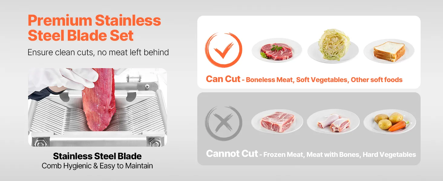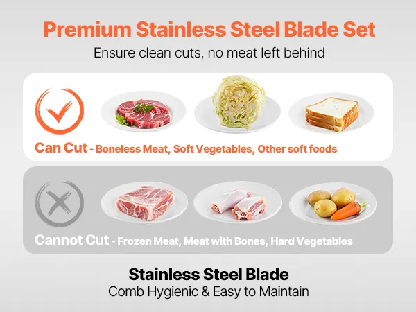 Handles Multiple Ingredients: Our meat cutter machine comes with a widened and enlarged feed port for added security and convenience. It's great for cutting boneless meats like pork, lamb, beef, and fish, as well as soft vegetables like cabbage and mushrooms. Not suitable for bone-in meats, frozen foods, or hard vegetables like potatoes, carrots, and lotus roots.
