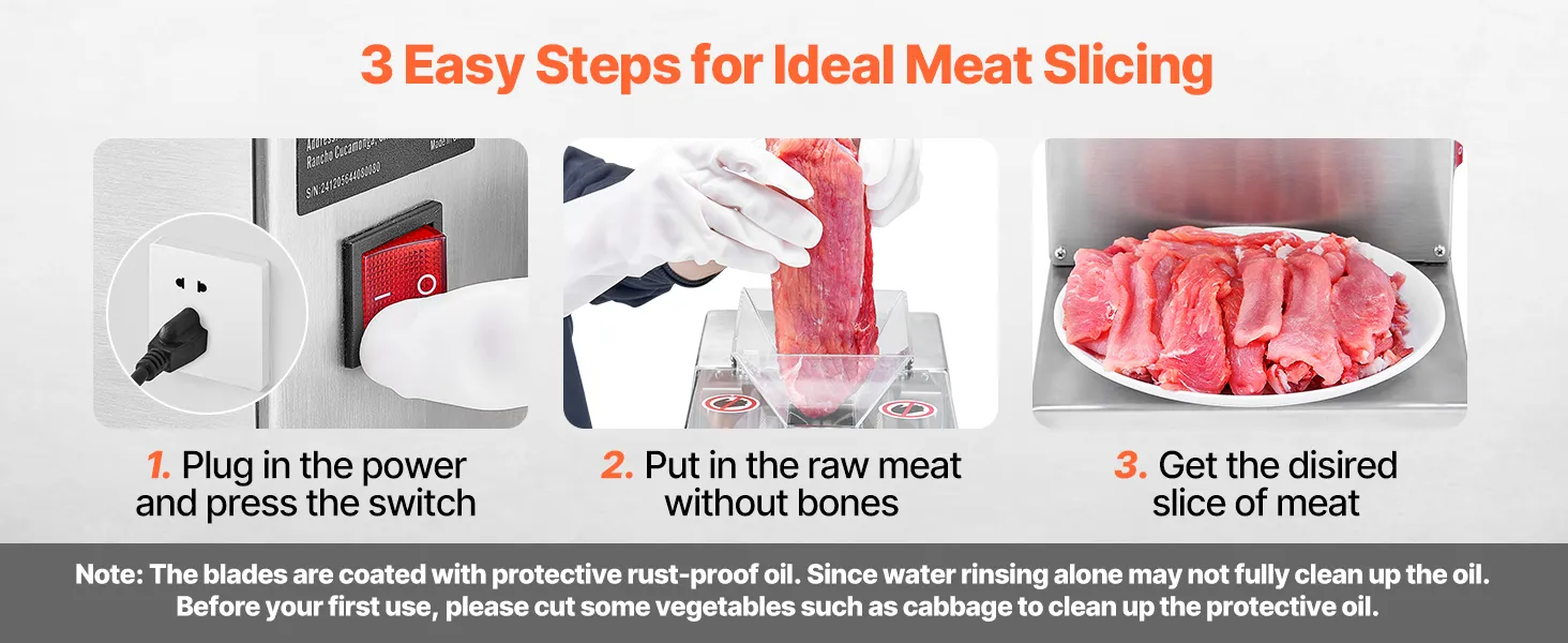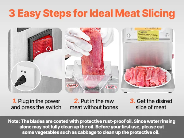Effortless Cleaning & Care: Our meat cutter cutting machine is easy to clean and maintain. The blades are coated with protective rust-proof oil. Since water rinsing alone may not fully clean up the oil, please cut some vegetables, such as cabbage, to clean up the protective oil before your first use.