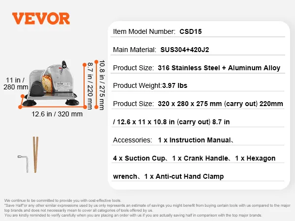 Instelbare snijdikte: de snijdikte kan individueel worden aangepast van 0 tot 6 inch (0-15 cm), afhankelijk van uw behoeften voor verschillende snijdiktes.