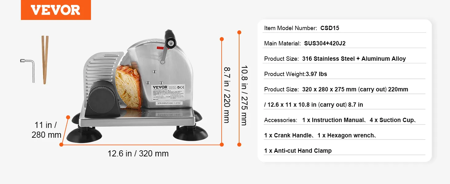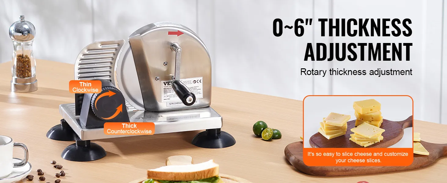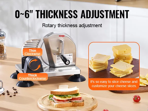 De VEVOR handmatige broodsnijder is een perfect hulpmiddel om de gewenste dikte van de snee te bereiken. Met zijn instelbare functie kunt u sneetjes van 0 tot 6 inch dik aanpassen. Of u nu dunne of dikke sneetjes prefereert, deze snijder voldoet aan uw behoeften. Het zorgt voor nauwkeurig snijden, waardoor het een waardevol hulpmiddel is in uw keuken. Ideaal voor zowel thuis- als commercieel gebruik, het brengt gemak en consistentie in uw tegelwerk. Geniet van uniforme sneetjes die de kwaliteit van uw gerechten verhogen met deze veelzijdige snijmachine.