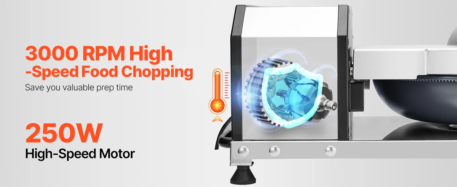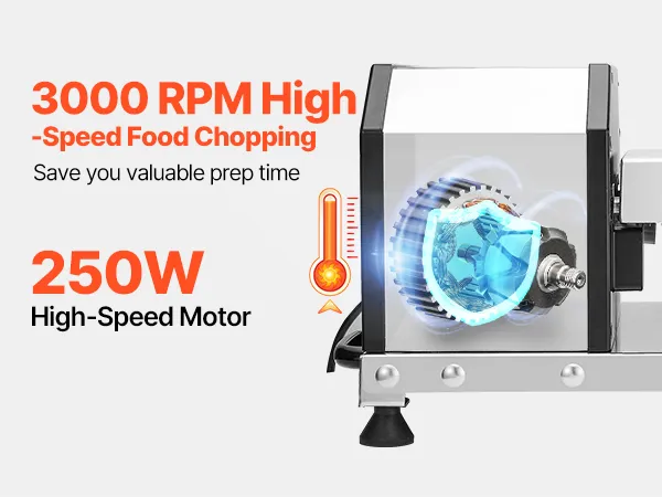Our food processor is equipped with a stable 250W motor and a speed of 3000 RPM, quickly chops food, helping you prepare ingredients in no time.
