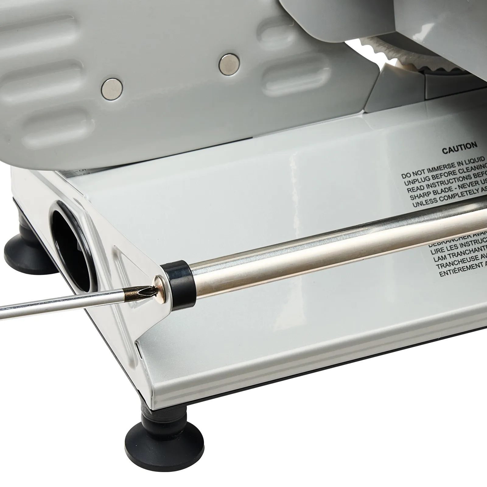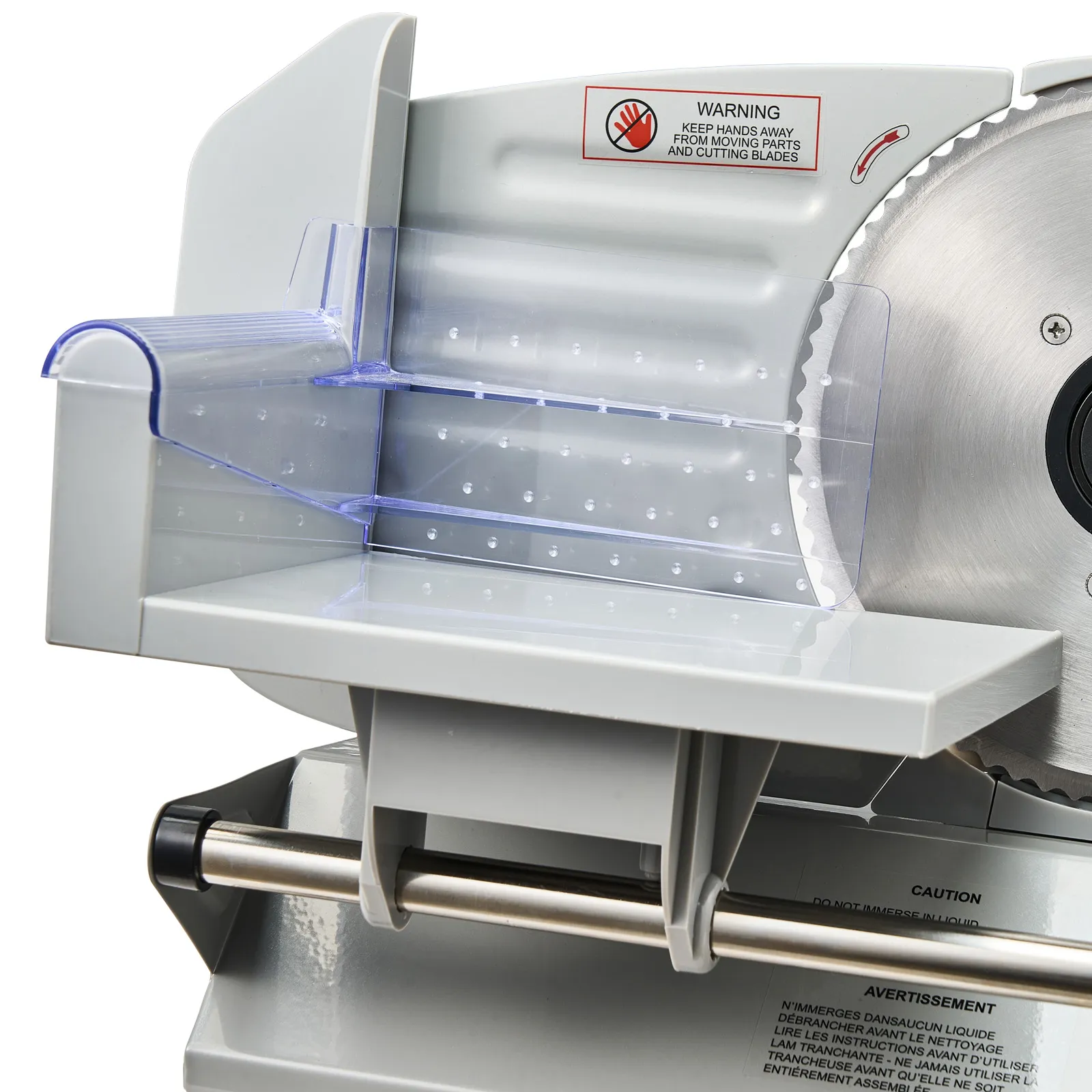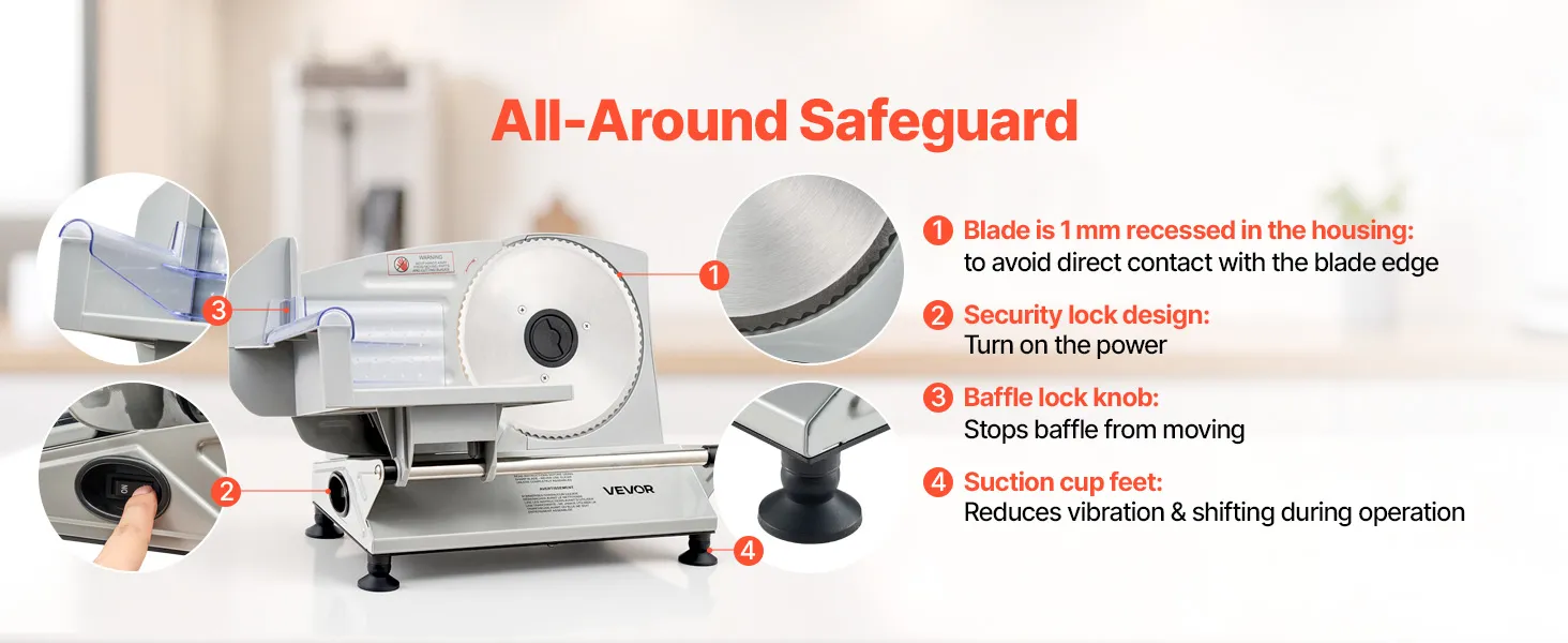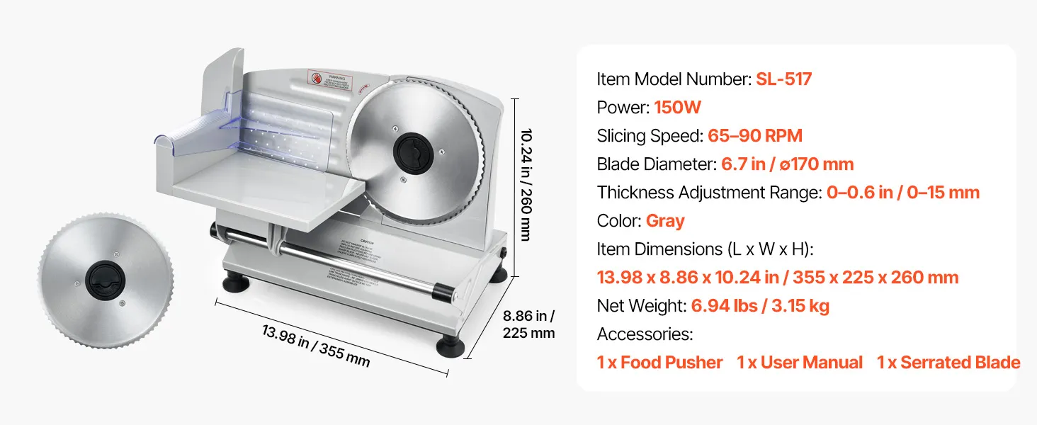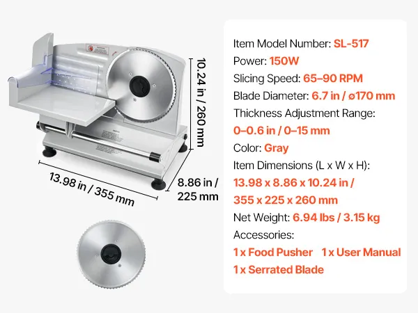 Eenvoudig te demonteren en schoon te maken: Voor extra gemak kunnen de slede, het mes, de voedselduwer en de duwverlenger eenvoudig worden gedemonteerd voor grondige reiniging, waardoor het onderhoud van deze snijmachine snel en gemakkelijk is.