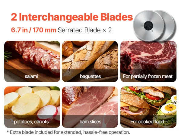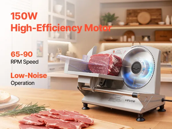 Efficiënt vlees snijden: Deze hoogwaardige vleessnijmachine is voorzien van twee gekartelde roestvrijstalen messen van 17 cm en wordt aangedreven door een motor van 150 W. Hij snijdt met een snelheid van 65 tot 90 omwentelingen per minuut, wat zorgt voor gladde en gelijkmatige sneden zonder vastlopen.