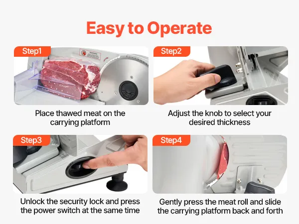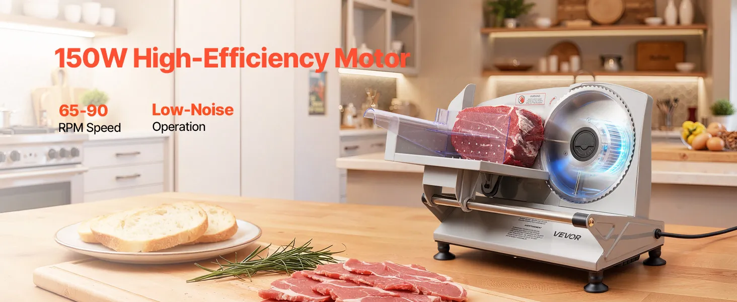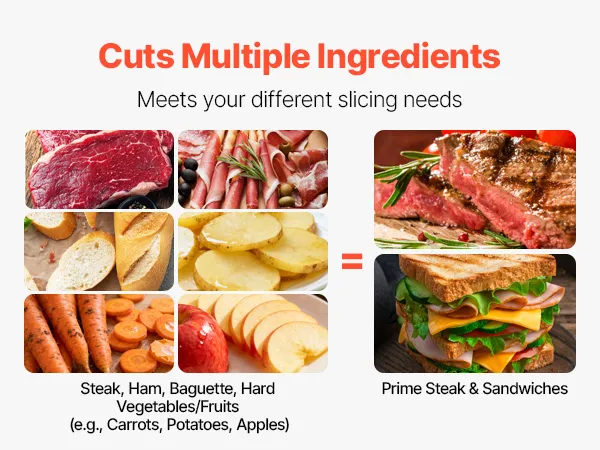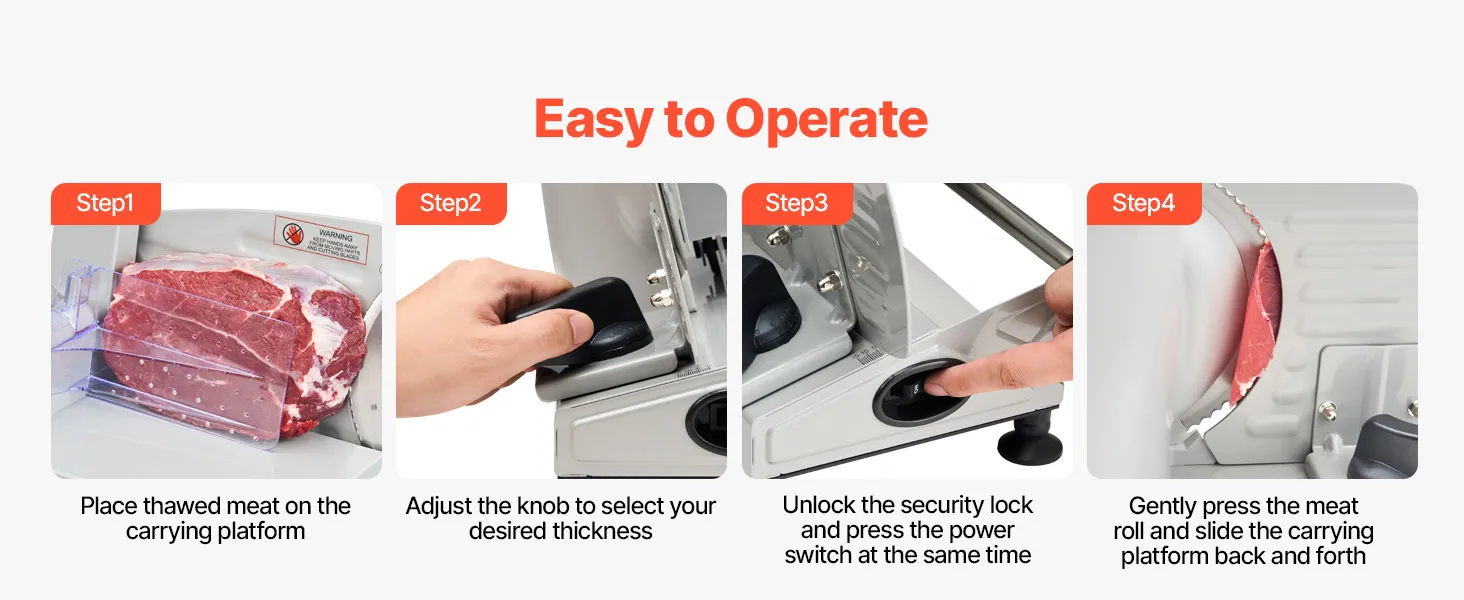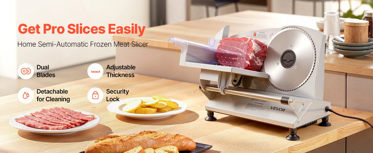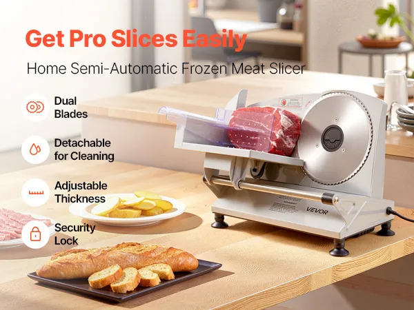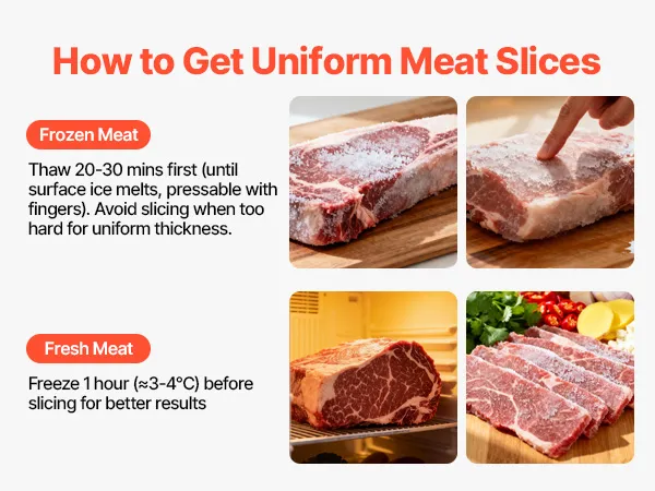 Geoptimaliseerd voor het snijden van bevroren vlees – verwerkt gemakkelijk gedeeltelijk of licht bevroren vlees. Bereik thuis gelijkmatig gesneden vlees van restaurantkwaliteit, zonder professionele kennis.