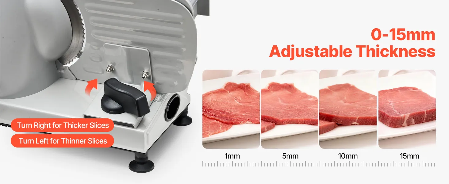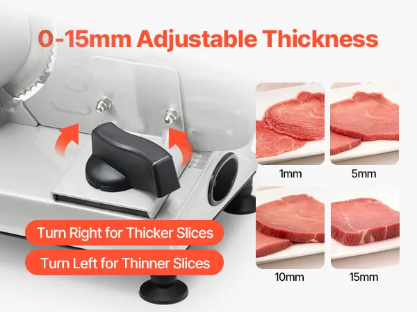 Dikte-instelling van 0–15 mm: Met een nauwkeurige draaiknop kunt u de snijdikte van deze elektrische snijmachine eenvoudig en precies instellen van 0 tot 15 mm (0 tot 0,6 inch) voor gelijkmatige plakjes. Ideaal voor het snijden van vlees, worstjes, rosbief, kalkoenfilet, stokbrood, groenten en fruit.