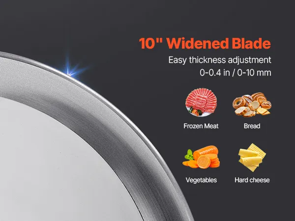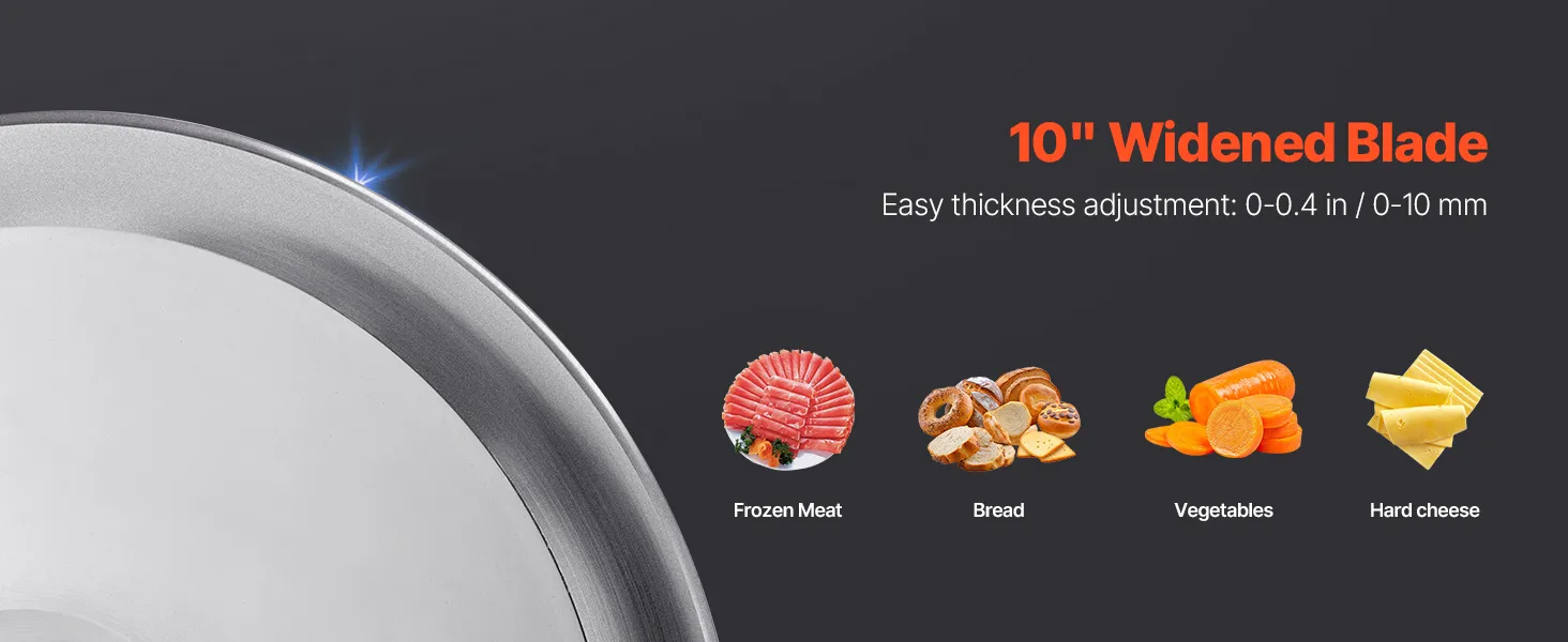 Upgraded 10" Blade: Our meat slicer is equipped with an upgraded 10" wider blade, effortlessly handling various food textures such as frozen meat, cheese, and bread. You can keep it sharp with the built-in blade sharpener.