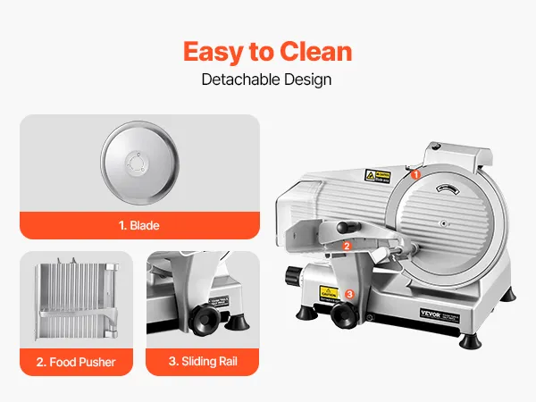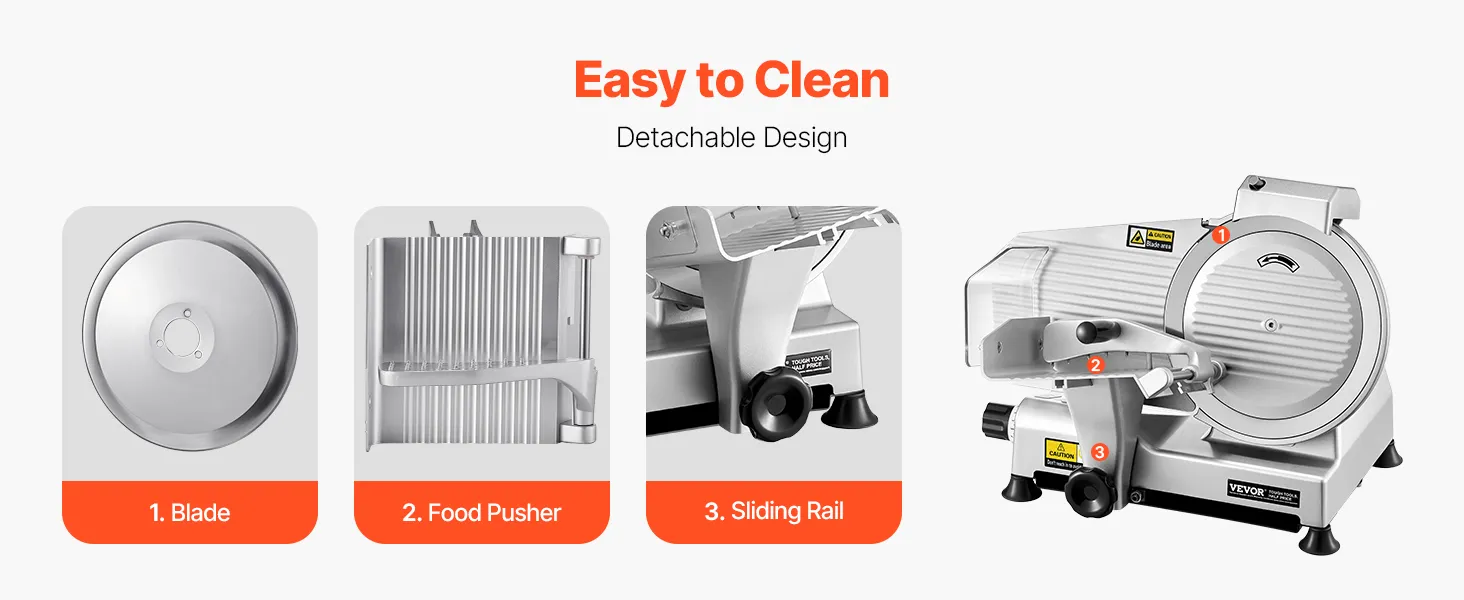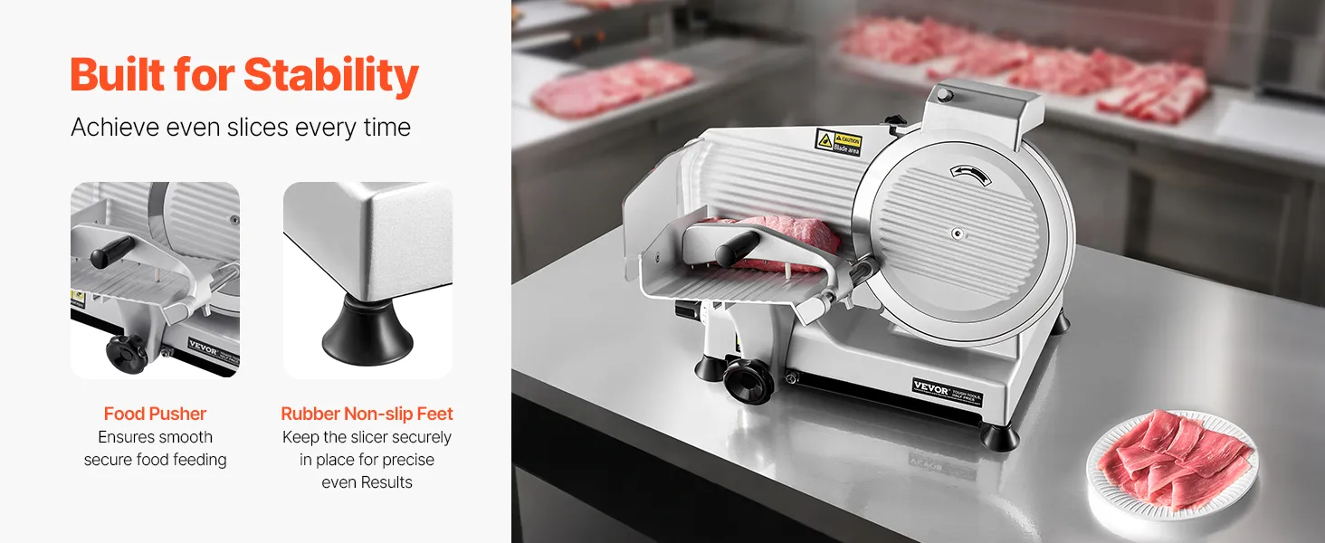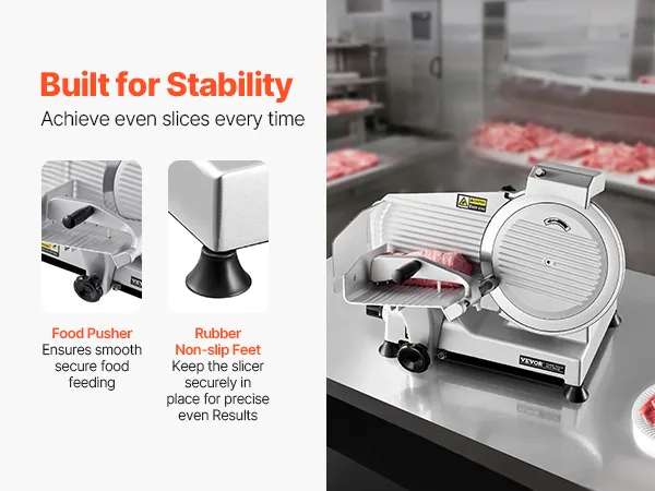 Stable & Secure: With a blade shield, a food pusher, and non-slip feet, our deli meat slicer provides steady and smooth meat slicing, keeping you secure while working. Meanwhile, the automatic food pusher boosts efficiency.