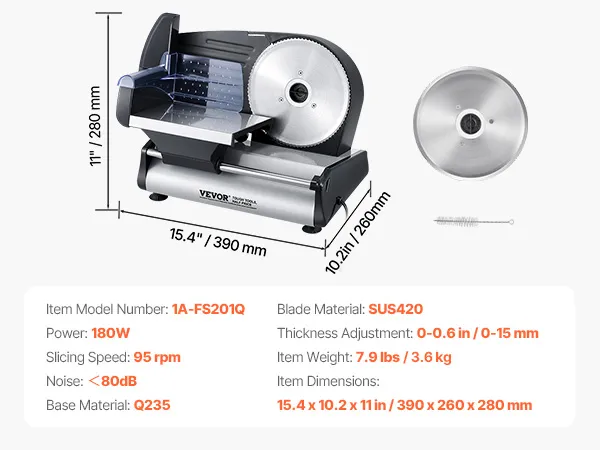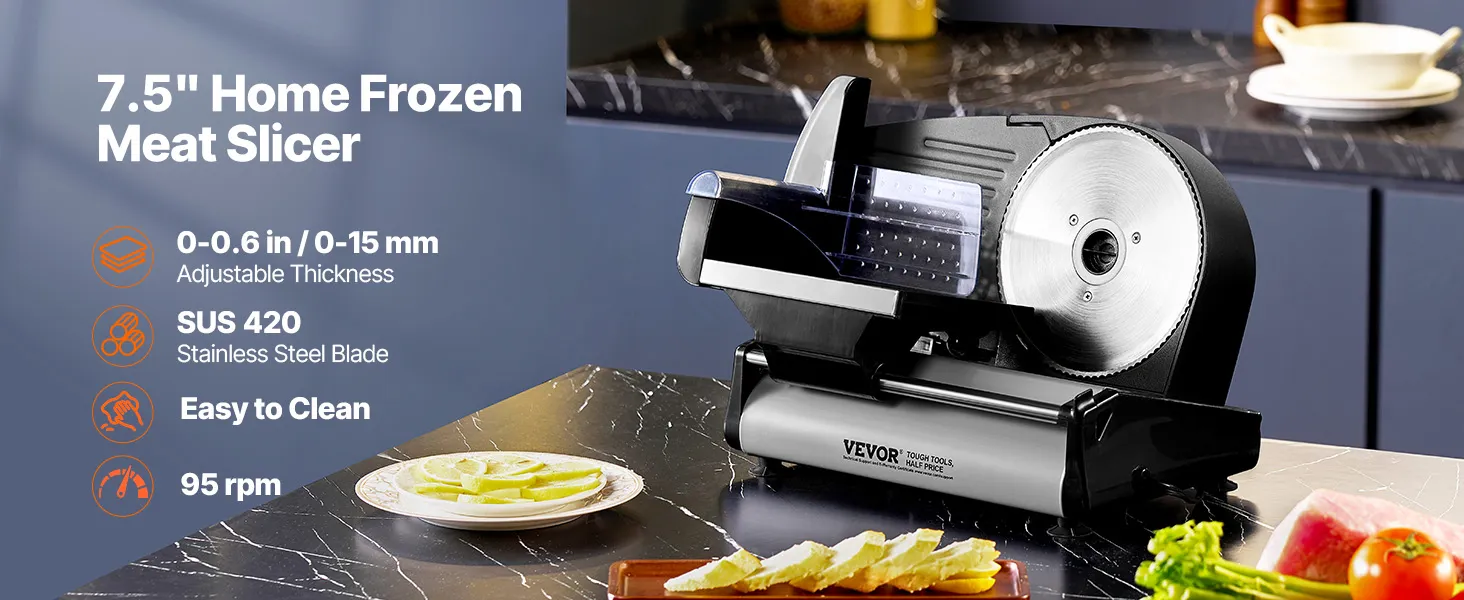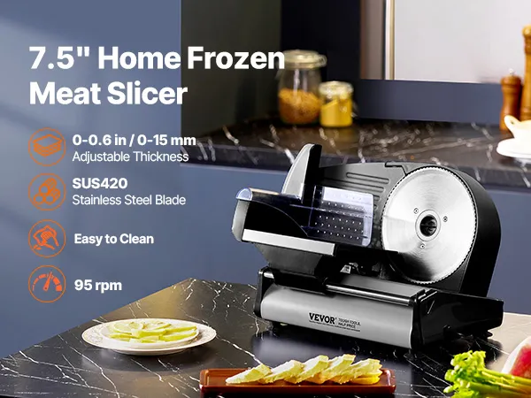190,5 mm roestvrijstalen messen: onze vleesmachine is uitgerust met verbeterde 7,5 inch (190,5 mm) SUS420 roestvrijstalen messen en snijdt moeiteloos voedsel met verschillende texturen, zoals bevroren vlees, kaas, ham en brood.