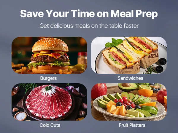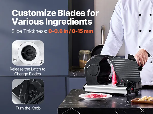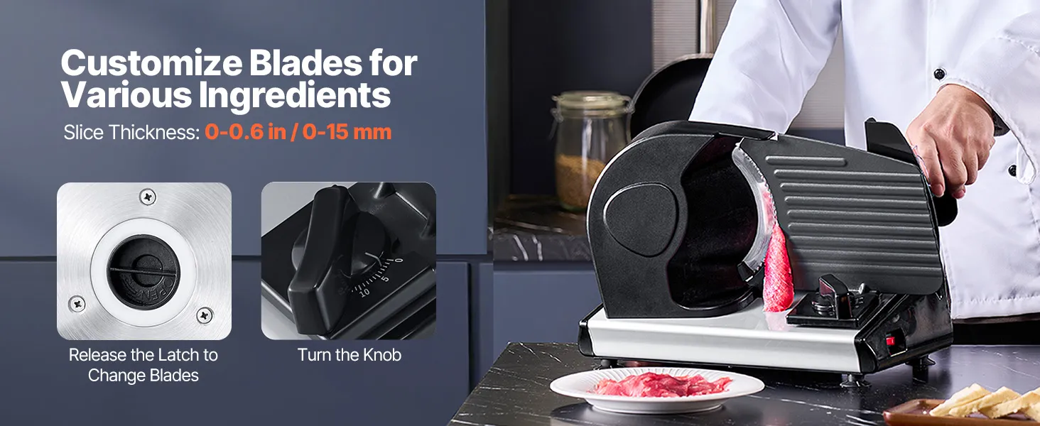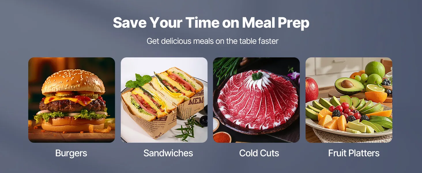 Instelbare dikte: De snijmachine heeft een knop voor het instellen van de dikte met een bereik van 0-0,6 inch (0-15 mm). U kunt de dikte eenvoudig aanpassen aan uw kookbehoeften. Ideaal voor het bereiden van hamburgers, broodjes, vleeswaren, fruitschalen en meer.