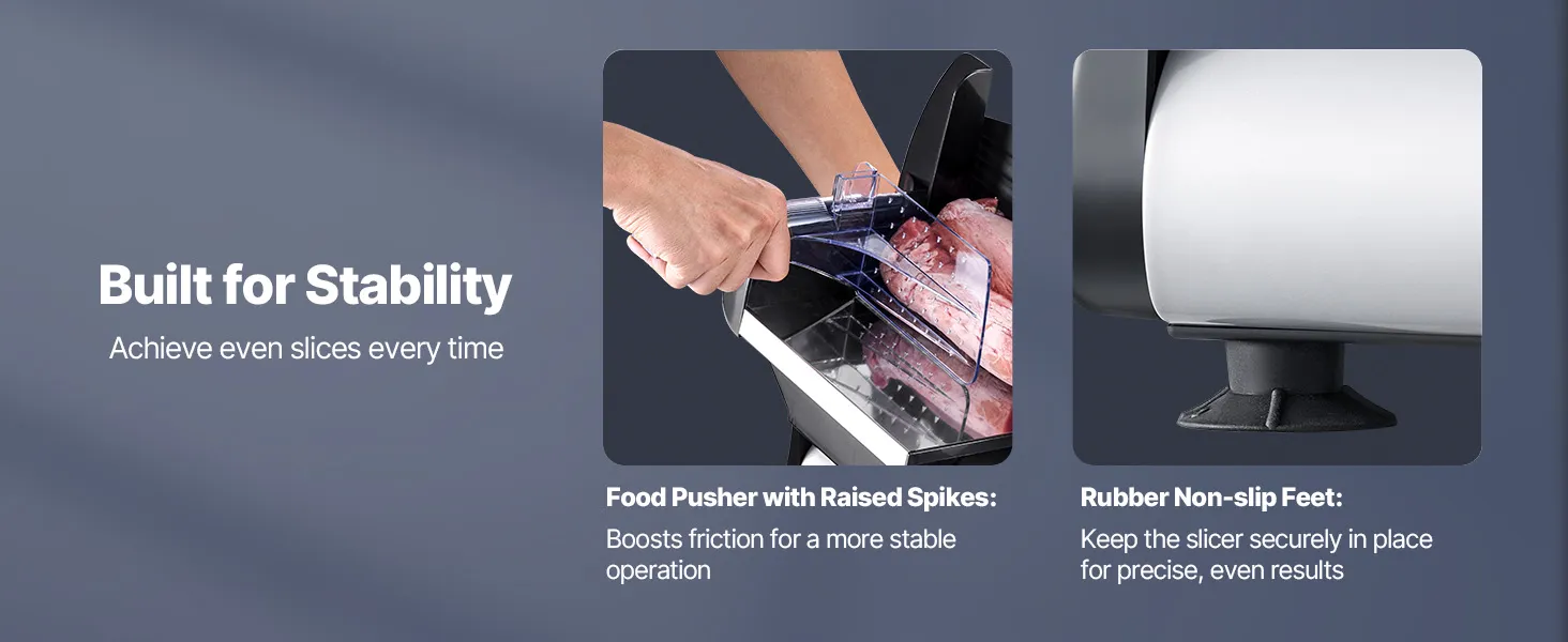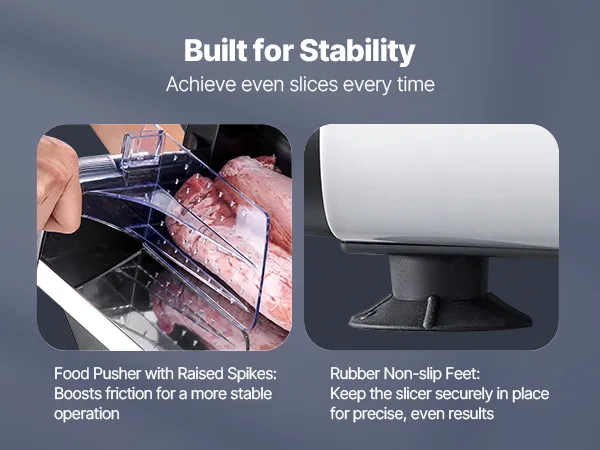 Stabiel en veilig: onze snijmachine is voorzien van een verhoogde voedselduwer met uitstekende punten en antislipvoetjes, waardoor het vlees stabiel en soepel wordt gesneden. Met de voedselduwer zorgt u effectief voor uw veiligheid tijdens het werk.