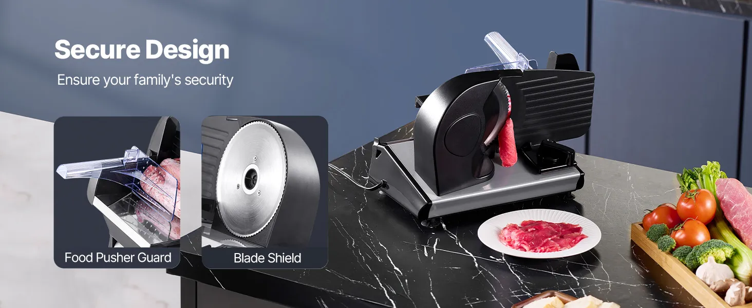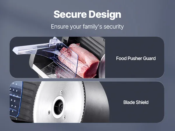 Onze snijmachine is uitgerust met een voedselduwer en een mesbescherming, zodat u en uw gezin veilig kunnen snijden.