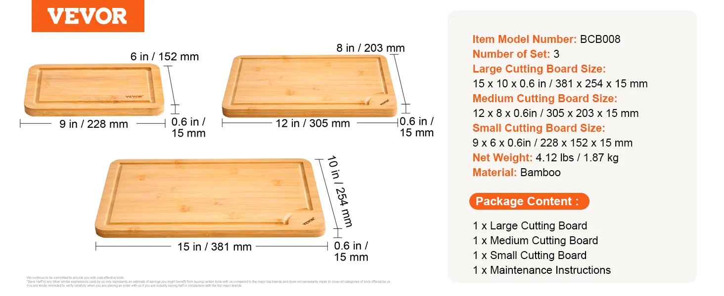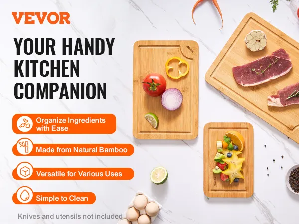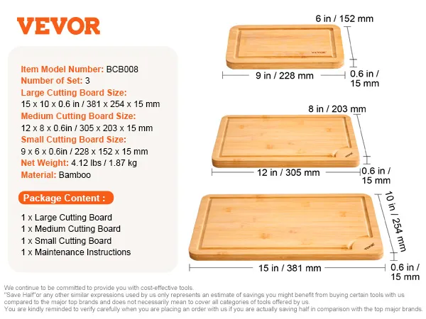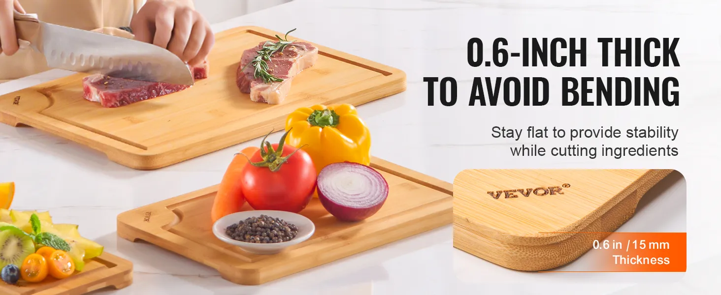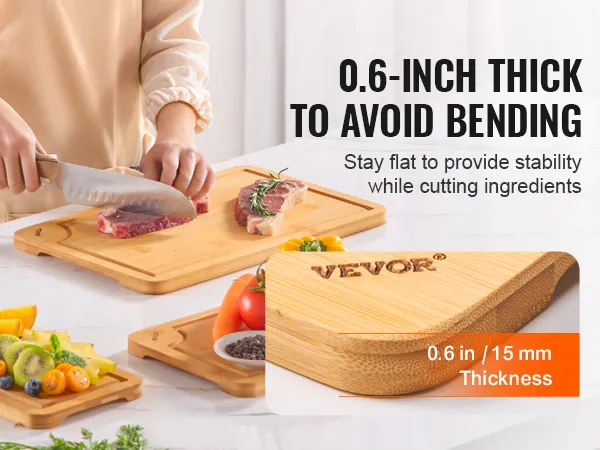 Natuurlijk bamboemateriaal: deze snijplankenset is gemaakt van duurzaam bamboe en is duurzaam. De dikte van 15 mm zorgt voor een lange levensduur, behoudt zijn vlakheid en vervormt niet, waardoor het een betrouwbare keuze is voor uw keuken.