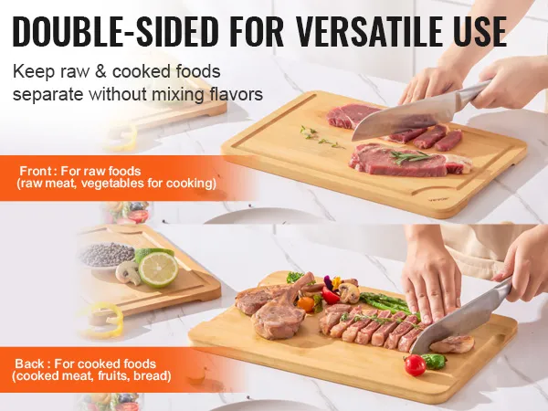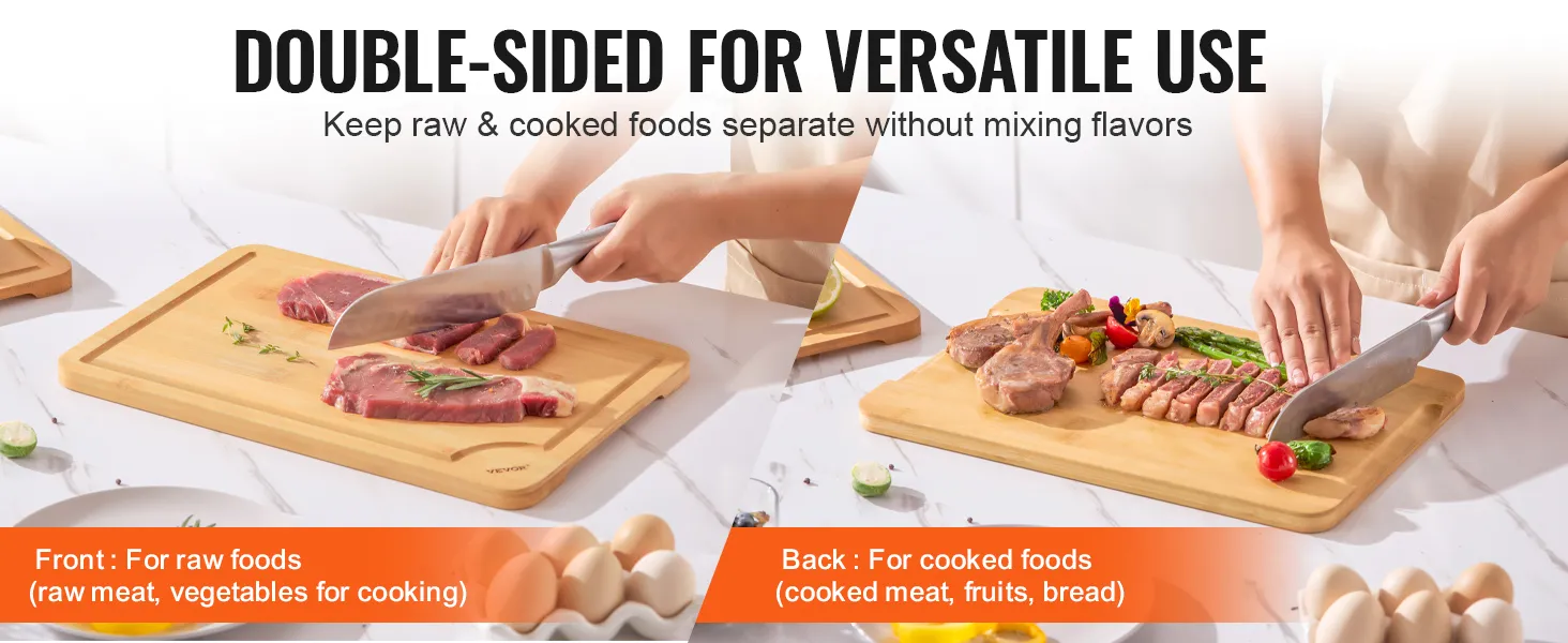 Doordacht ontwerp: met sapgroeven om vloeistoffen op te vangen, waardoor rommel en schoonmaakinspanningen worden geminimaliseerd. Dankzij de handgrepen aan beide zijden is hij gemakkelijk te verplaatsen en door het dubbelzijdige ontwerp kan hij afzonderlijk worden gebruikt voor rauw en gekookt voedsel.