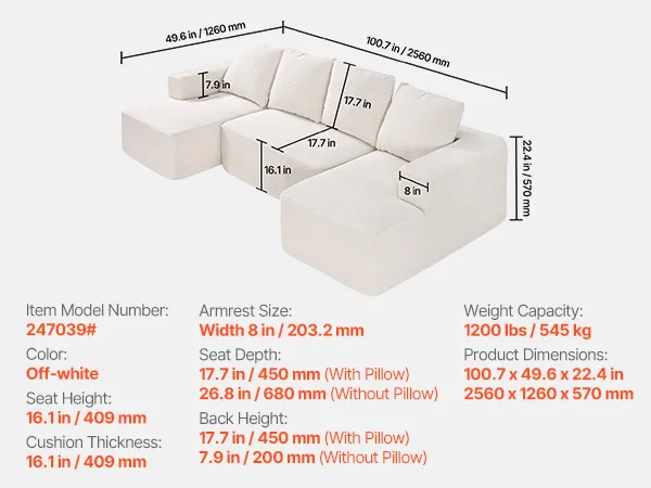 Spacious and Supportive Seat: With a 17.7 inches / 450 mm deep seat and a solid 1200 lbs / 545 kg capacity, this U shape couch provides roomy comfort and reliable support for deep relaxation.