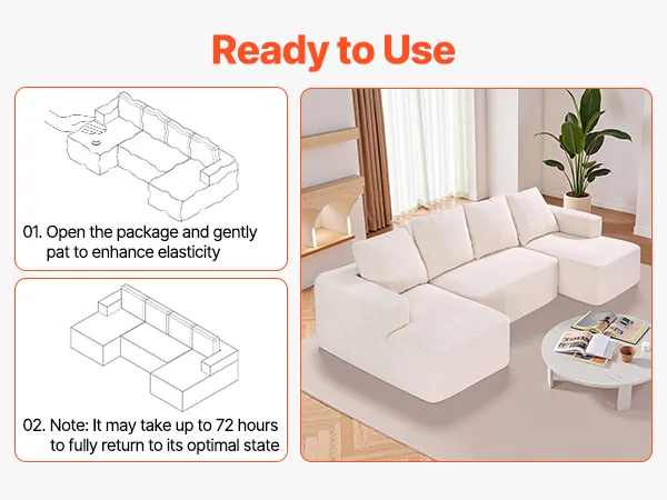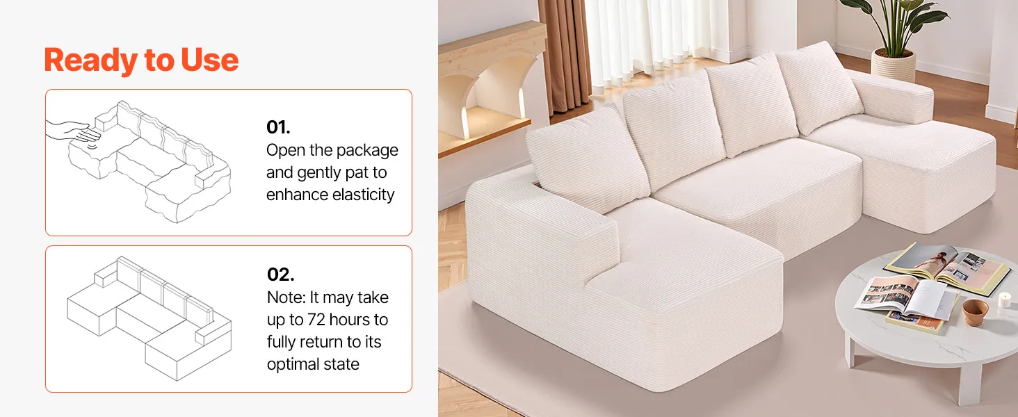 Just unpack, fluff up, and your modular sofa is ready to go! Give it 72 hours to fully expand and settle into its form.