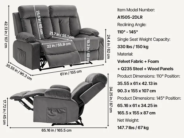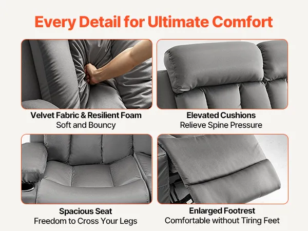 Hoogwaardige materialen: Met een metalen frame en meerlaags hout ondersteunt elke stoel tot 150 kg. Schuim met hoge dichtheid biedt langdurig comfort en ondersteuning voor hoofd, rug en benen, terwijl de fluwelen stof zacht en gemakkelijk schoon te maken is.