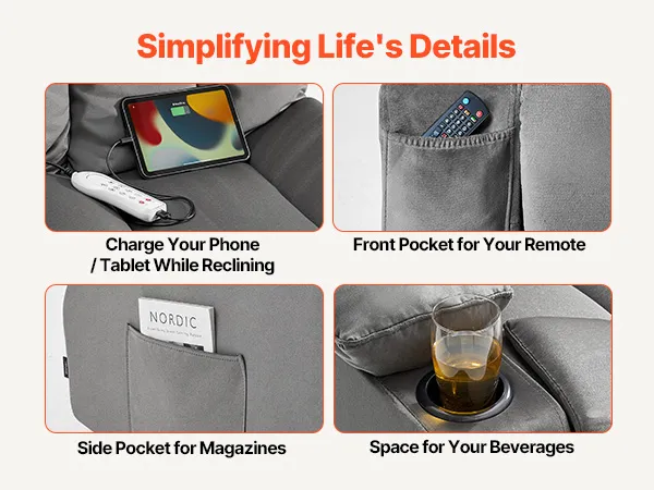 Doordachte kenmerken: Deze relaxfauteuil is voorzien van USB- en Type-C-oplaadpoorten, opbergvakken aan de voor- en zijkant en twee bekerhouders. Ideaal voor ontspanning en comfort.