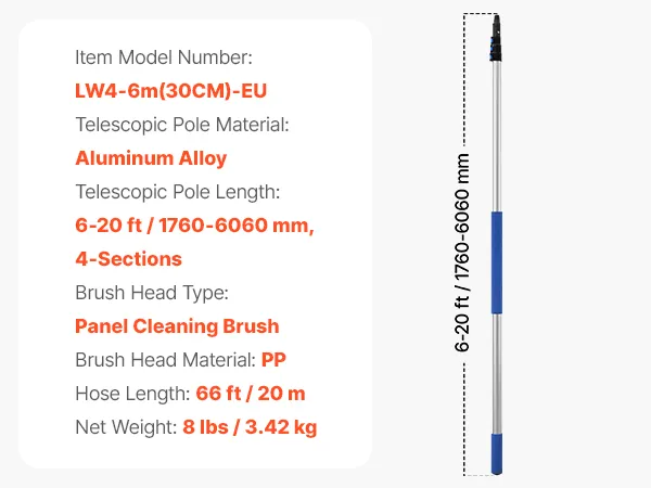 • Ontworpen voor langdurig gebruik: De steel van de telescopische reinigingsborstel is gemaakt van een hoogwaardige aluminiumlegering. Hij is lichtgewicht, roestbestendig en daardoor geschikt voor gebruik buitenshuis in alle weersomstandigheden. Dankzij de robuuste constructie kan hij alle reinigingstaken op zonnepanelen aan.