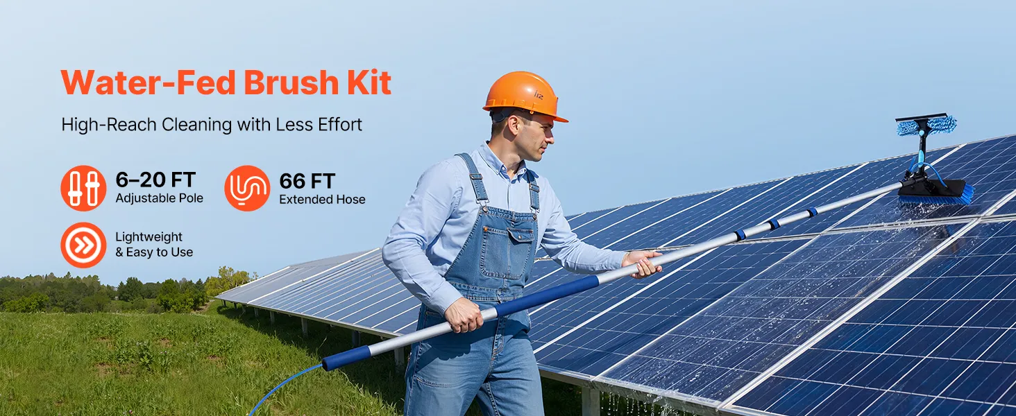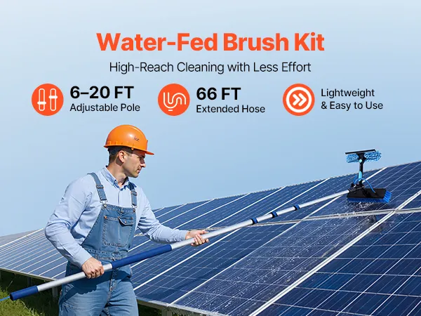 • Complete accessoire set: De fotovoltaïsche reinigingsset met wateraansluiting bevat een 20 meter lange slang voor eenvoudige wateraansluiting. Dankzij snelkoppelingen is de set compatibel met standaard tuinslangen en ultrazuiverwatersystemen en geschikt voor zowel particuliere als commerciële reiniging.