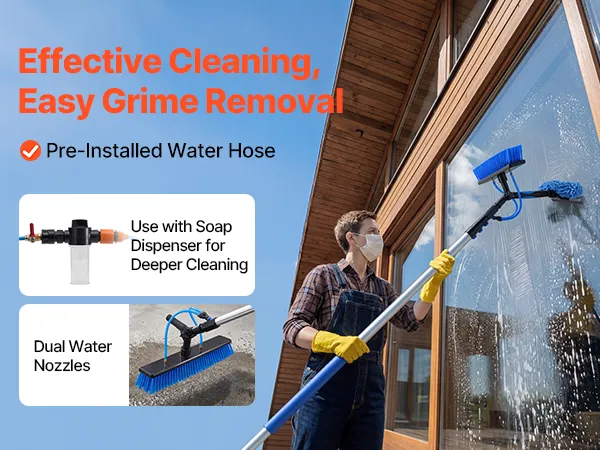 • Efficiënte reiniging: Deze reinigingsset voor zonnepanelen bevat twee watersproeiers, een zeepdispenser en snelkoppelingen voor het aanpakken van hardnekkige vlekken. Het verwijdert grondig hardnekkig vuil, veegt watervlekken voorzichtig van glas en verwijdert stof en spinnenwebben.
