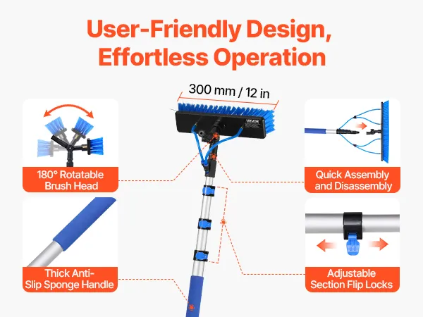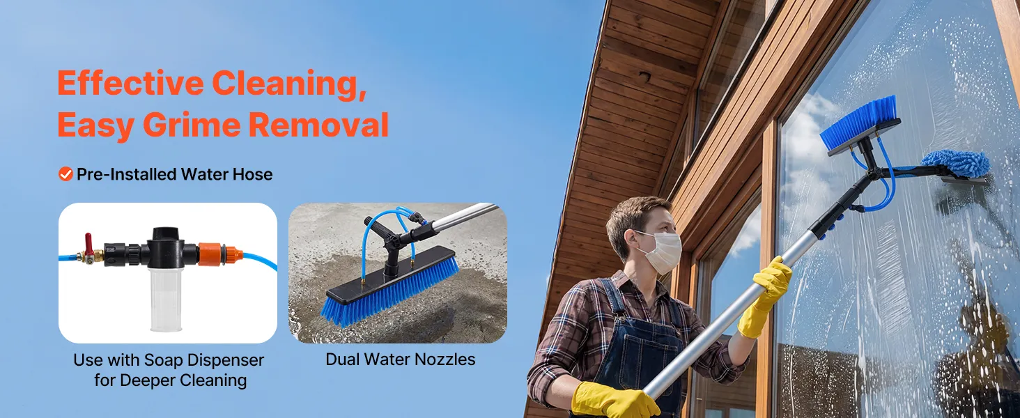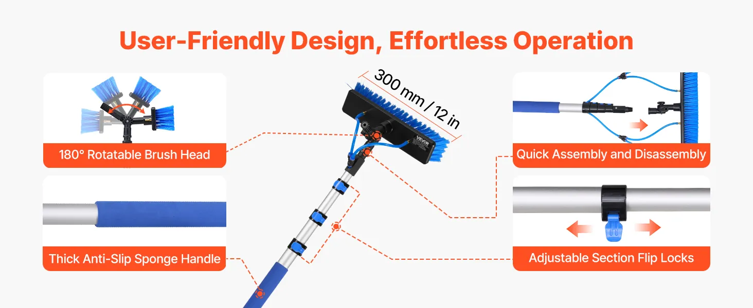 • Comfortabele grip: Onze zonnepanelenreinigingsset met wateraansluiting is voorzien van een 180° draaibare borstelkop voor reiniging vanuit verschillende hoeken. De handgreep is bekleed met een dikke, antislip spons, wat zorgt voor een comfortabele grip en vermoeidheid tijdens langdurige reinigingssessies vermindert.