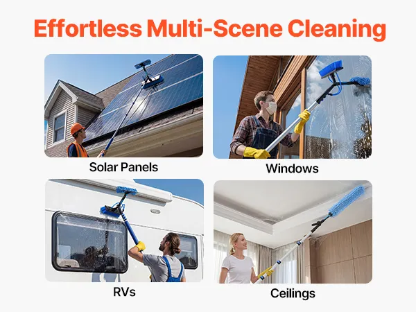 Deze multifunctionele reinigingsset met borstel en steel voor zonnepanelen is geschikt voor diverse toepassingen, waaronder in huis en tuin. Hij reinigt efficiënt zonnepanelen, ramen, plafonds, serres, campers en reclameborden.