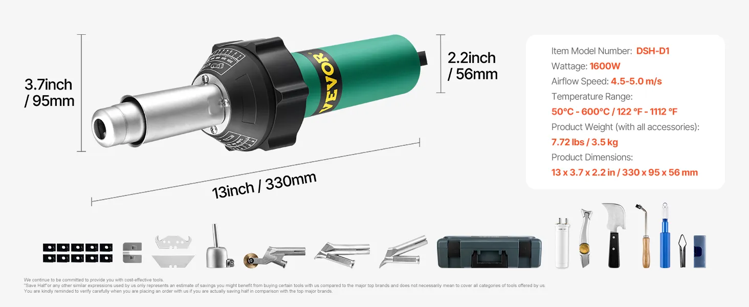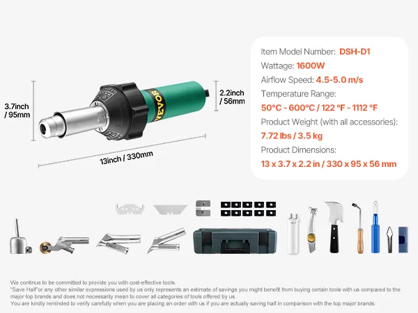 PROFESSIONELE PLASTIC LASSET: VEVOR PVC-laspistoolset bevat alles wat u nodig heeft voor nauwkeurig lassen: 5 mm standaard mondstuk, rolgeleidingsmondstuk, gereedschapskist, 4 mm en 5 mm ronde mondstukken, lasschraper, vlinderclip, groefmes met houten handvat, 10 U- gevormde messen, 1600W verwarmingskern, haakmessen met messen, trapeziumvormige messen en een dolfijnmessenset met platte en V-vormige messen.