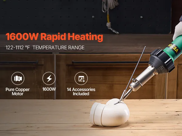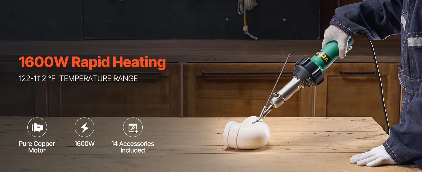 Het hetelucht-kunststoflasapparaat van VEVOR is voorzien van een krachtige motor van puur koper van 1600 W die zorgt voor snelle verwarming voor efficiënt lassen. Het bevat een professionele kunststof lasset (met 14 accessoires).