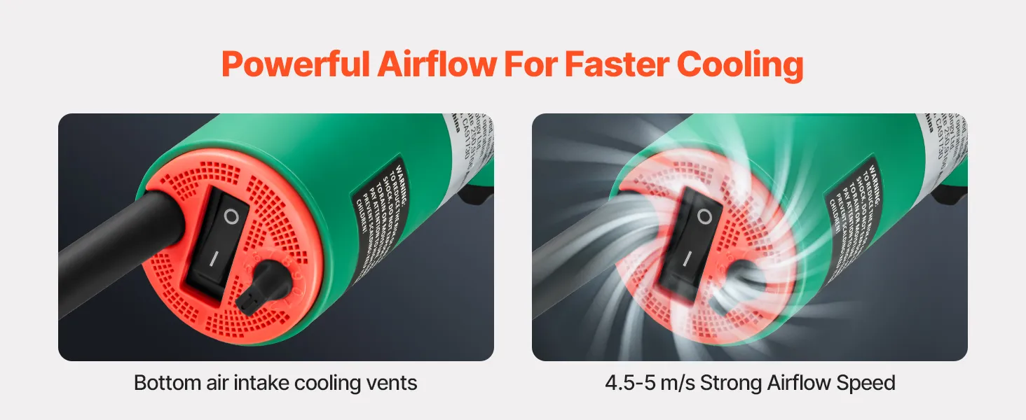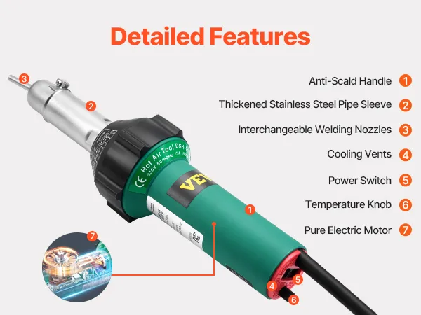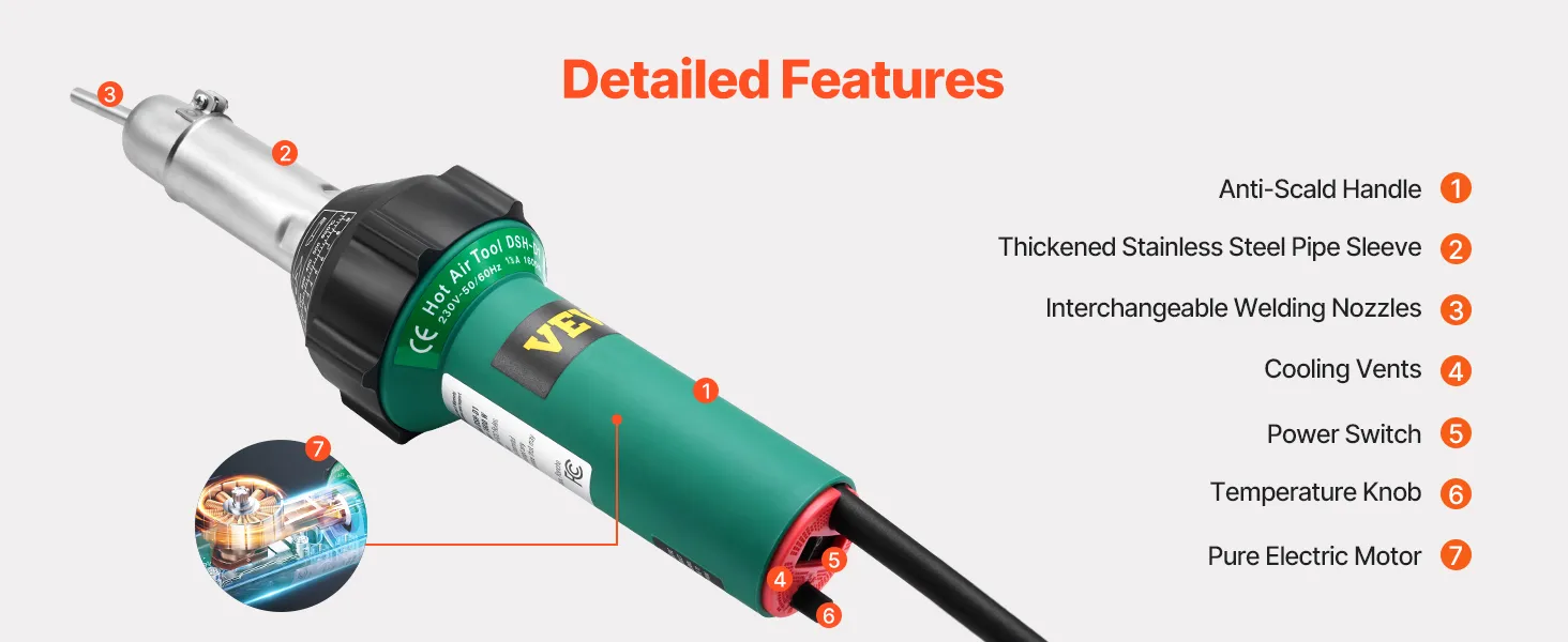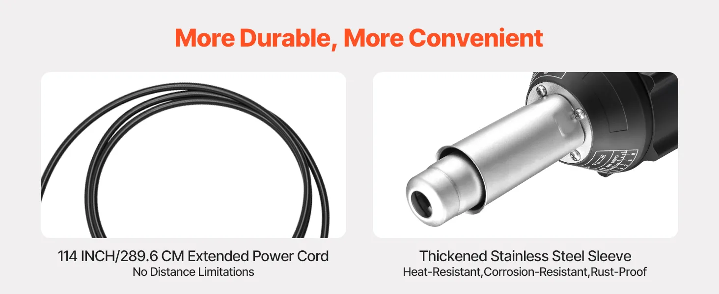 Het VEVOR kunststof las-heteluchtpistool heeft 4 mondstukken - perfect voor zowel nauwkeurig PVC-buislassen als werkzaamheden op grote oppervlakken, zoals dekzeilreparaties. Schakel eenvoudig tussen mondstukken om elke taak aan te pakken.