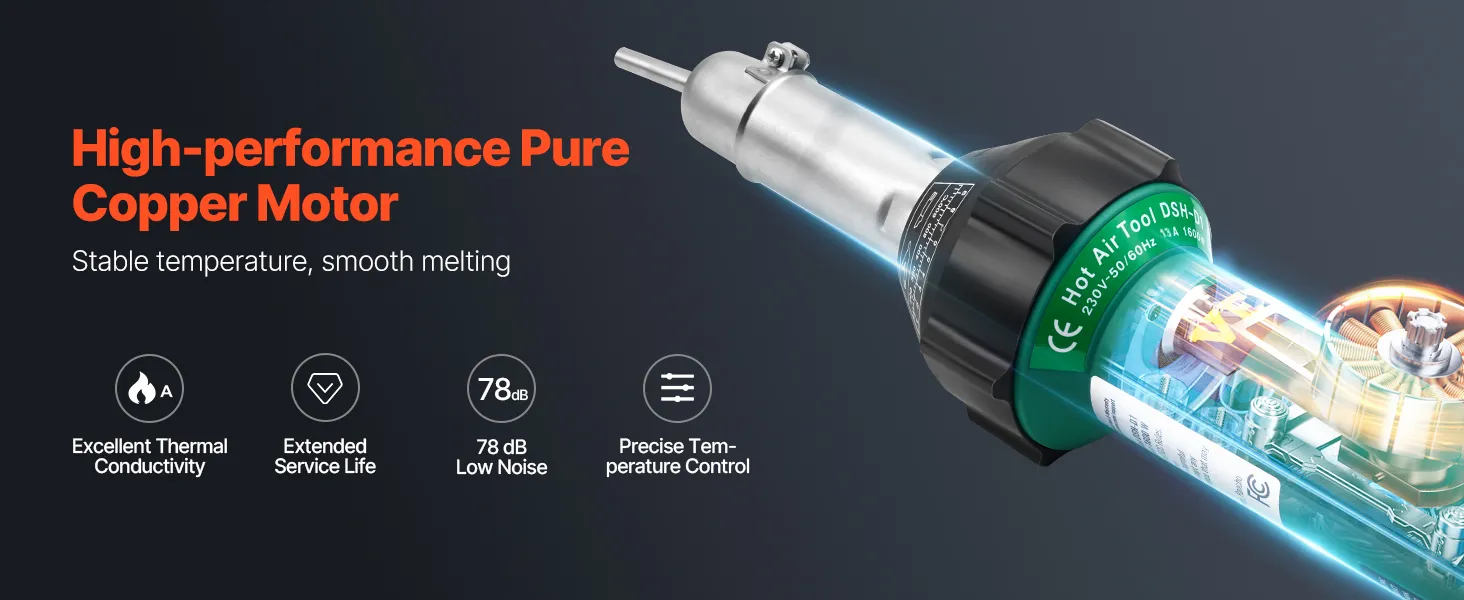 Het VEVOR-lasapparaat is voorzien van een krachtige puur koperen motor voor stabiele temperaturen en uitstekende thermische geleidbaarheid. Door de nauwkeurige temperatuurregeling verloopt het smeltproces soepeler.