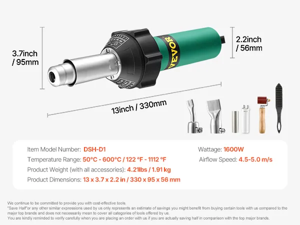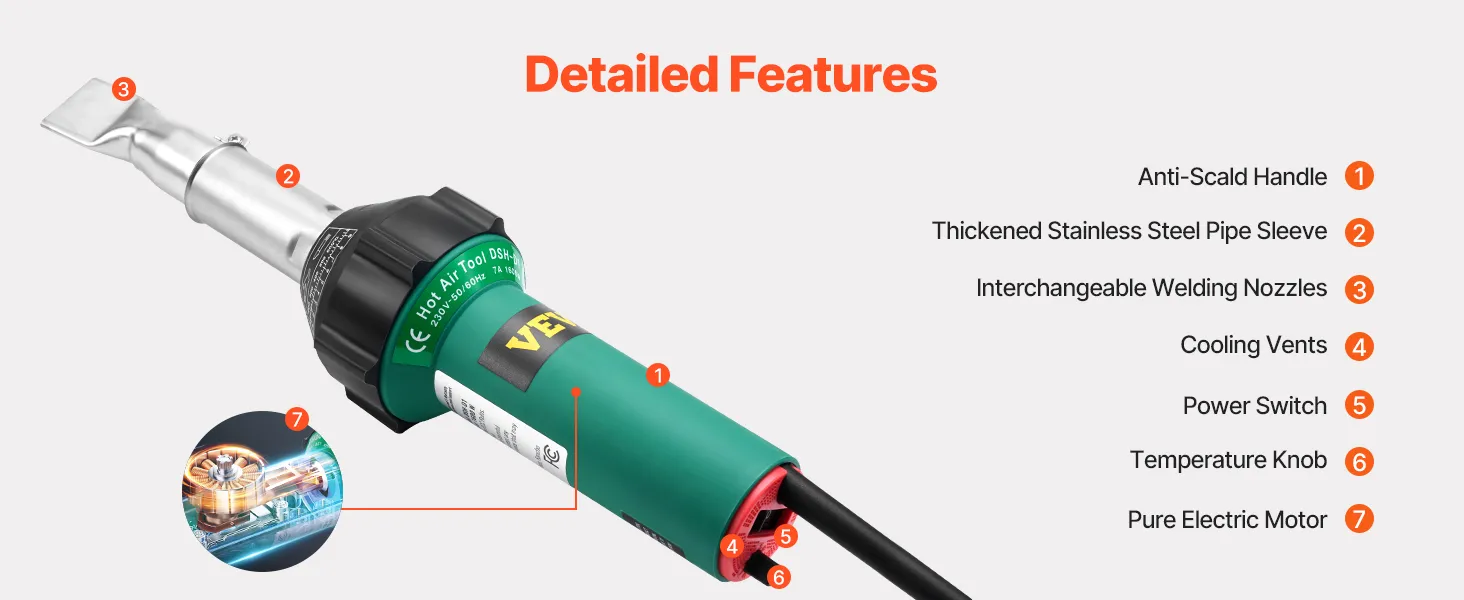 VEVOR hot air plastic welder features 1600W pure copper motor, delivering fast heating for efficient welding. It includes 2 flat nozzles, a heating core, a seam roller, and a wire brush. With 9-level temp control, efficient cooling, and long power cord, it is ideal for beginner and pros.