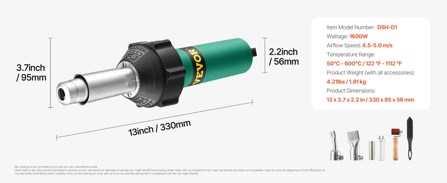Easy to Use & Carry: The VEVOR hot air plastic welder kit is built with a powerful 1600W motor, making it ideal for shaping, welding, and bending thermoplastics. Compact and ergonomic, it’s easy to hold, lightweight to carry, and suitable for both beginners and professionals.