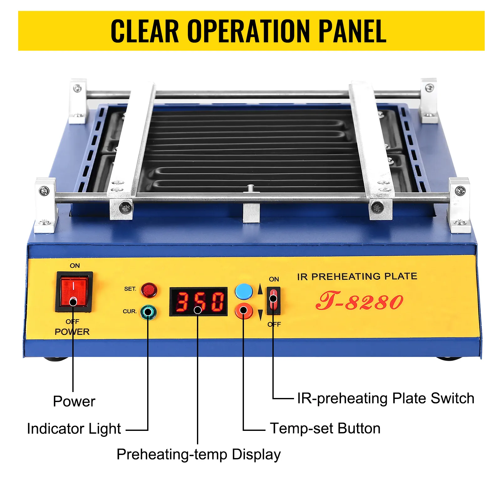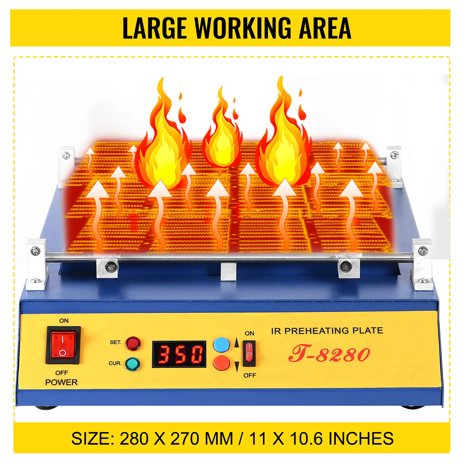 • 【GROTE WERKBANK】- Het vermogen van de T-8280 soldeerstationmachine is 1600W en de afmeting van de werkbank is 280 x 270 mm / 11 x 10,6 inch. Met de instelknop en schuifgeleider kunt u eenvoudig de werkgrootte van het solderen regelen.