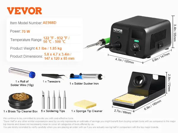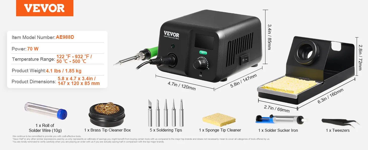VEVOR Soldering Iron Station, 70W Digital Display Soldering Station Kit, 122°F- 932°F Temp Control & Built-in Transformer, Auto Standby & Sleep Mode, with 5 Soldering Tips, Lead-Free Solder, Tweezers