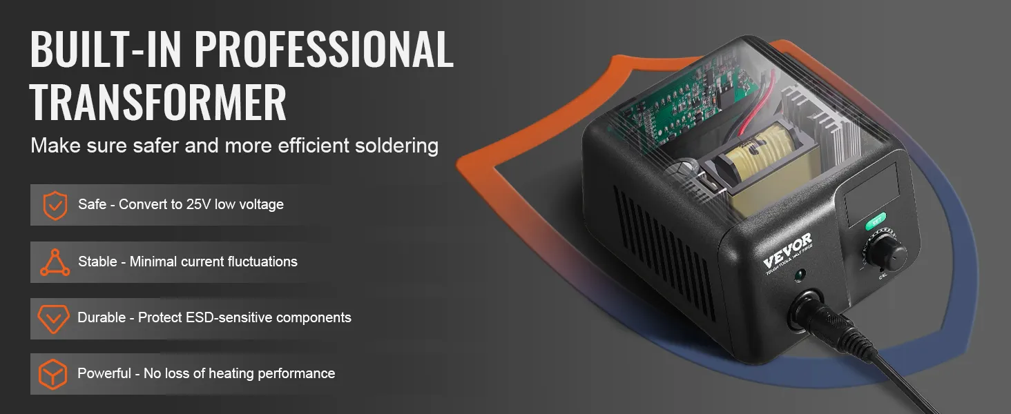 Safe and Reliable: Built in professional transformer, this soldering iron station ensures safer, more efficient soldering. 25V low voltage enhances safety while providing a stable current with minimal fluctuations, protecting ESD-sensitive components and extending device lifespan.
