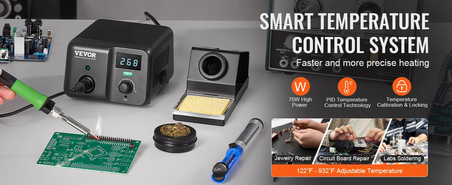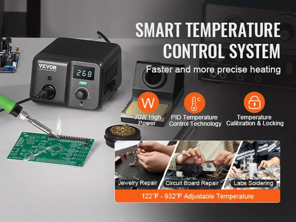 Smart temperature control for faster, more precise heating! With 70W high power, PID temperature control and 122℉-932℉ adjustable temperature, this soldering iron station ensures efficient soldering, ideal for circuit board repair, jewelry repair, DIY projects, etc.
