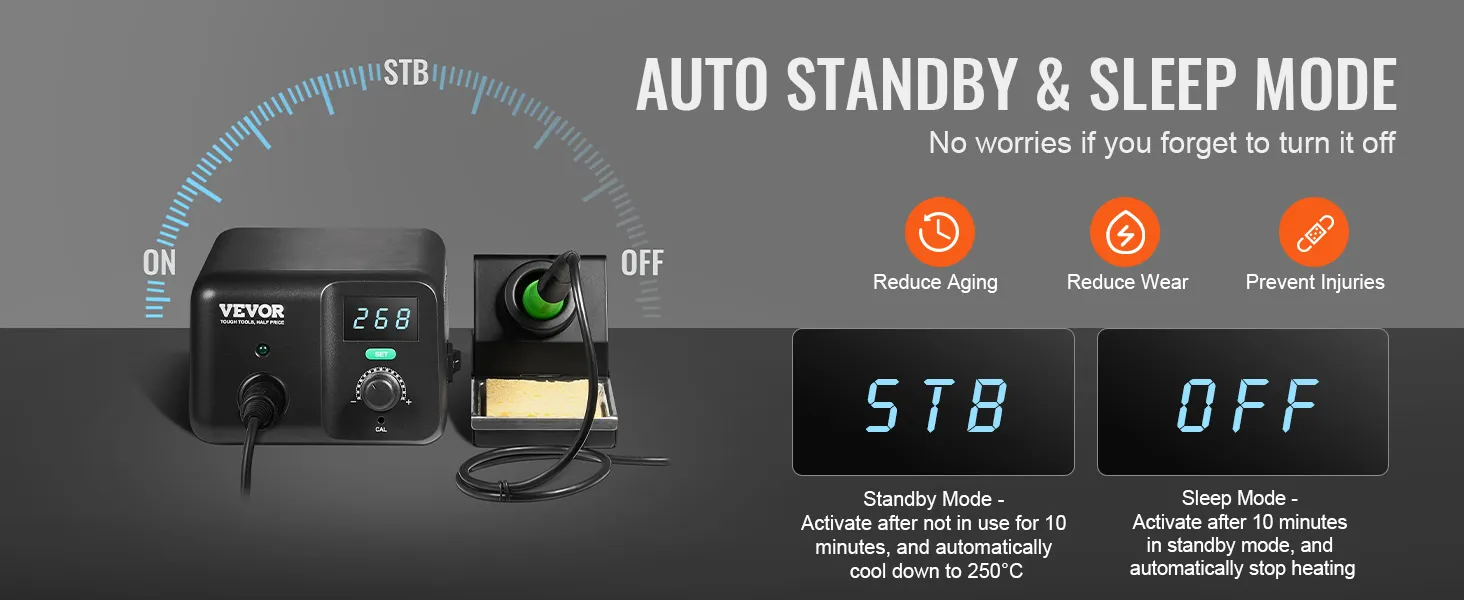 Auto Sleep Mode: Enhance the safety of your soldering tasks with automatic standby and sleep modes! These intelligent features protect the heating element, extend the station’s lifespan, and minimize the risk of accidental injuries, ensuring a safer and more efficient soldering experience.