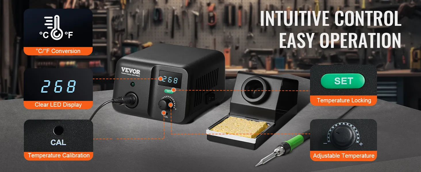 This digital soldering station features an easy-to-use temperature adjustment knob and a clear LED display for easy viewing. Equipped with temperature locking, calibration, and ℃/℉ conversion, it’s designed to meet a variety of needs.