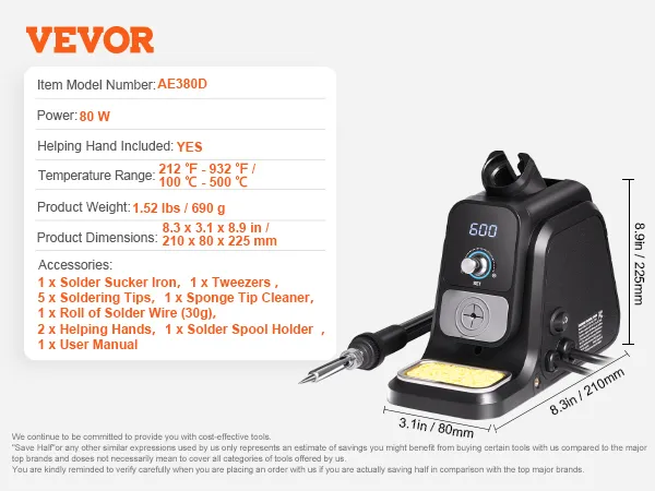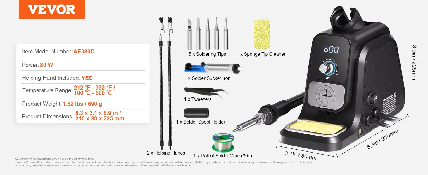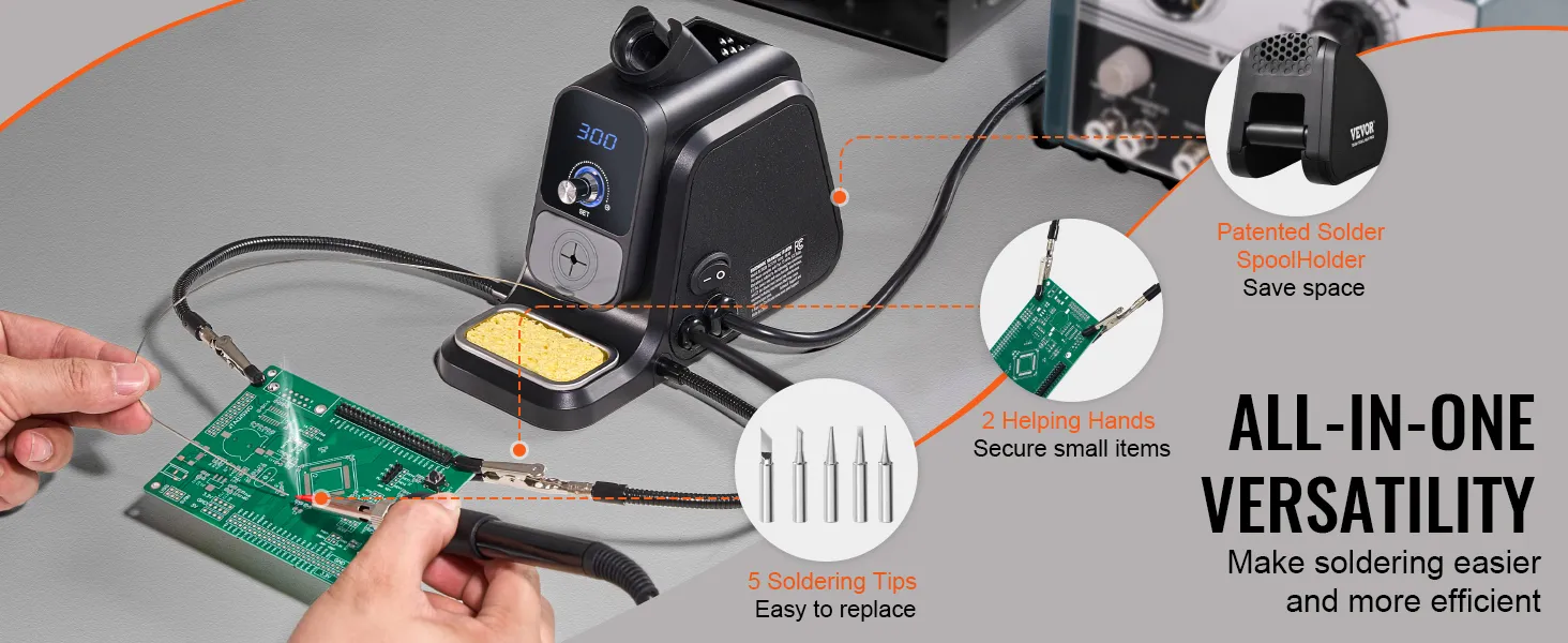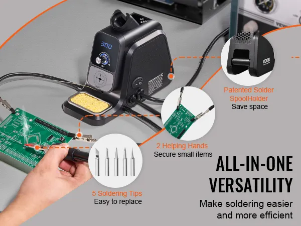 Dit soldeerstation is voorzien van een gepatenteerde soldeerspoelhouder die de soldeerdraad stevig op zijn plaats houdt, waardoor het werk gemakkelijker wordt. Met 2 helpende handen die voorwerpen stabiel vasthouden en je handen vrij laten en 5 universele soldeerpunten die gemakkelijk te vervangen zijn, voldoet hij aan een verscheidenheid aan behoeften.