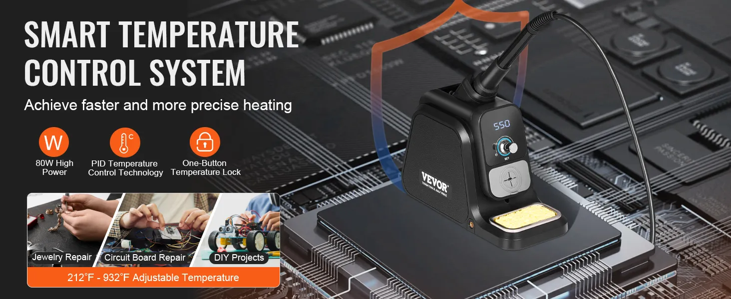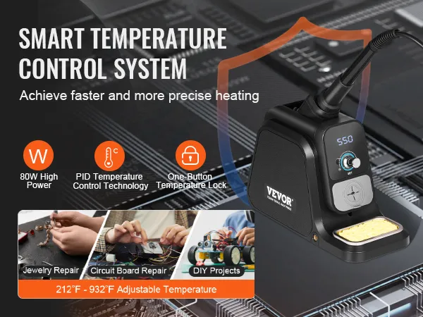 Intelligente temperatuurregeling voor snellere, nauwkeurigere verwarming! Met een hoog vermogen van 80 W, PID-temperatuurregeling en instelbare temperatuur van 212 °F tot 932 °F zorgt dit soldeerboutstation voor efficiënt solderen, ideaal voor reparatie van printplaten, sieradenreparatie, doe-het-zelf-projecten, enz.