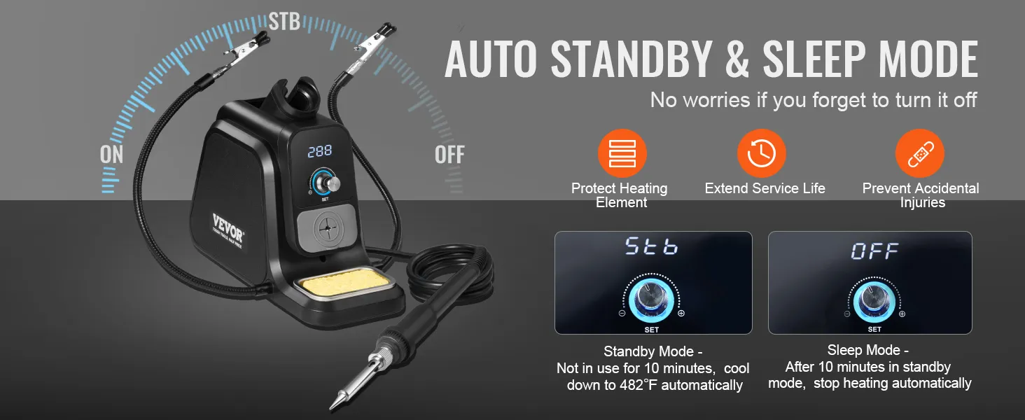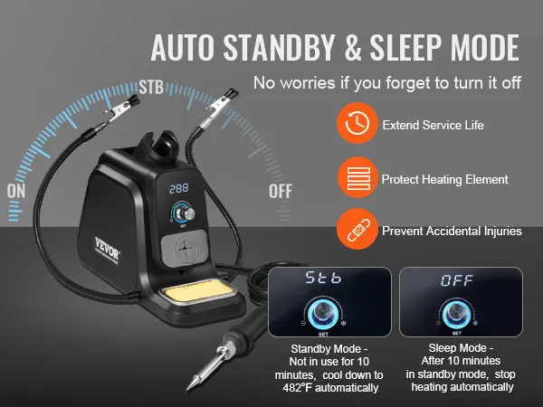 Automatische stand-by- en slaapmodus zorgen voor de veiligheid van uw soldeerwerkzaamheden! Doordachte functies beschermen niet alleen het verwarmingselement en verlengen de levensduur van het station, maar helpen ook onbedoelde brandwonden te voorkomen, waardoor een veiligere en efficiëntere soldeerervaring wordt gegarandeerd.