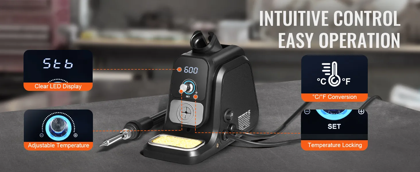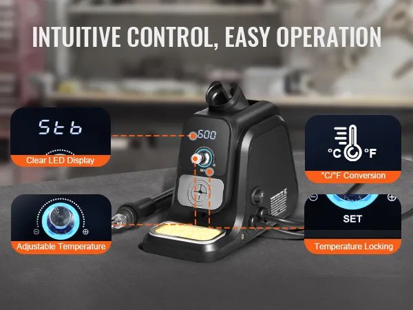 Eenvoudig te gebruiken: dit soldeerstation biedt een intuïtieve bediening met eenvoudige temperatuuraanpassing via de draaiknop, duidelijk digitaal LED-display, ℃/℉ eenheidconversie en temperatuurvergrendeling met één knop. Uitgerust met uitgebreide accessoires, is hij perfect voor zowel beginners als professionals.